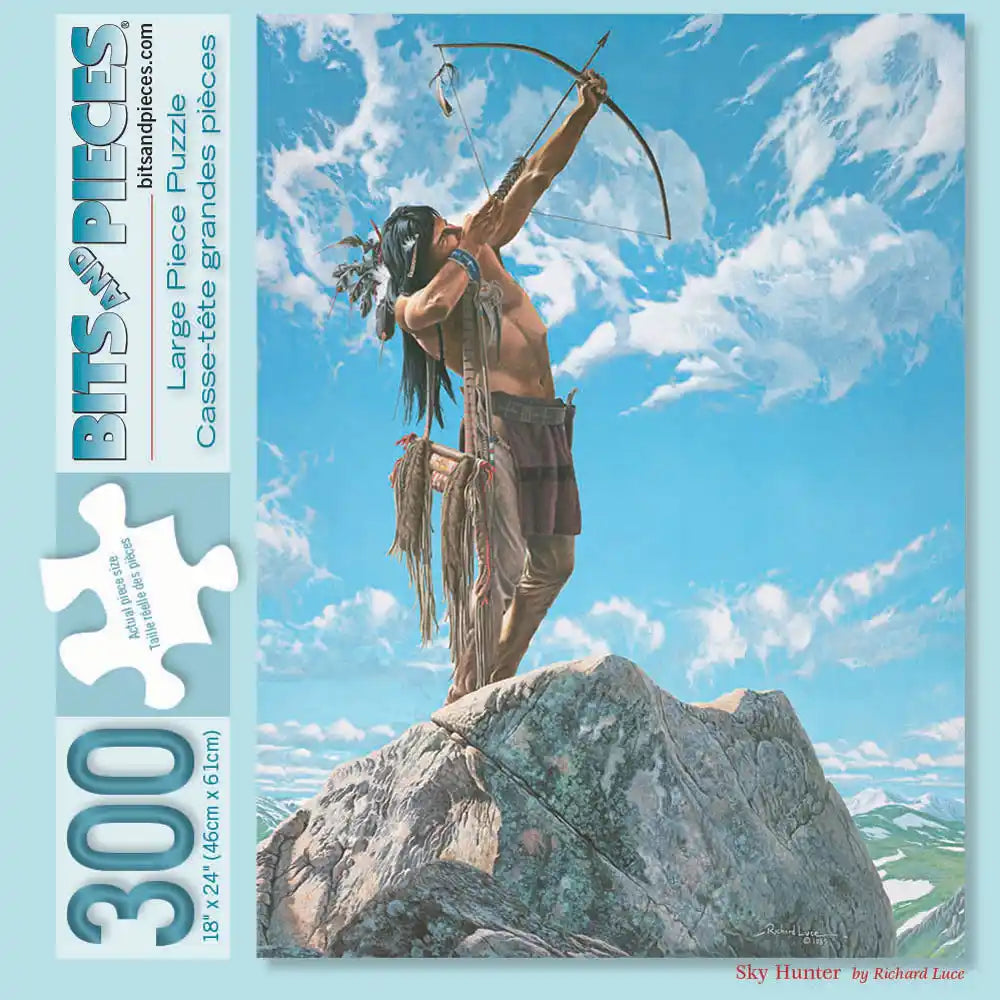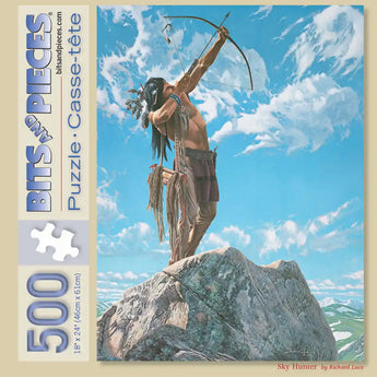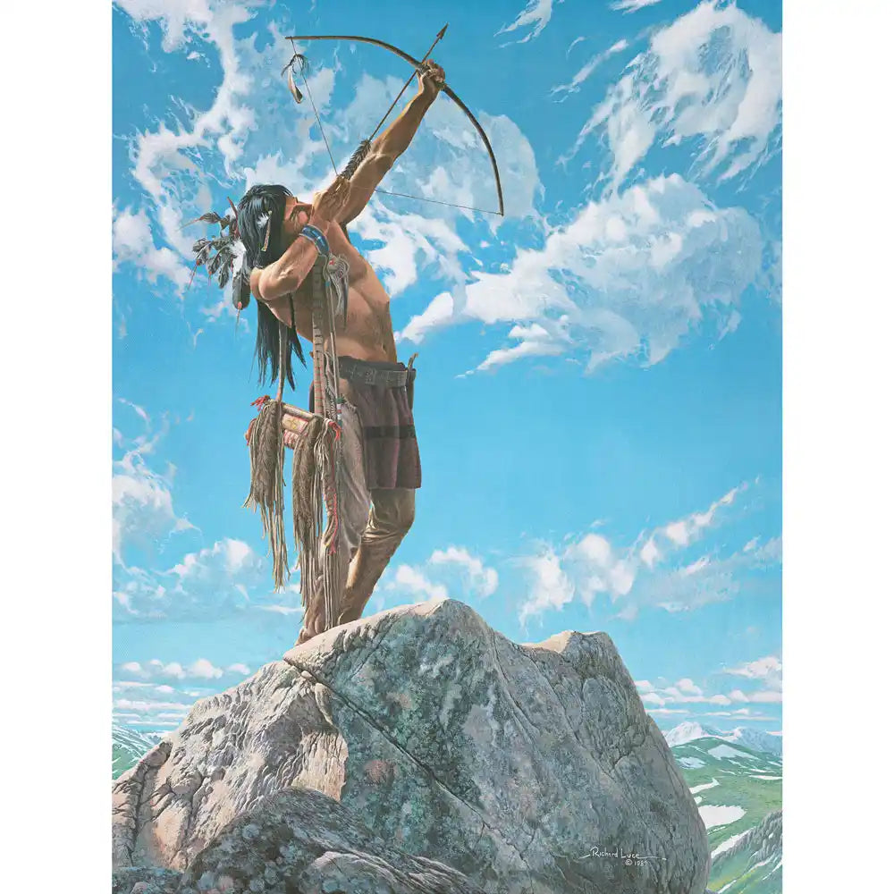 This jigsaw puzzle is designed by Richard Luce. A Native American man shoots an arrow into the sky atop a rocky cliff. Available in multiple piece counts.
