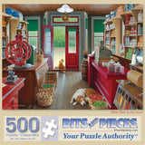 This 500 piece jigsaw puzzle is designed by John Sloane and measures 18" x 24". The cat stands watch at the door of the store waiting for customers on the slow day. The dog takes advantage of the quiet with a nap. Available in two piece count.