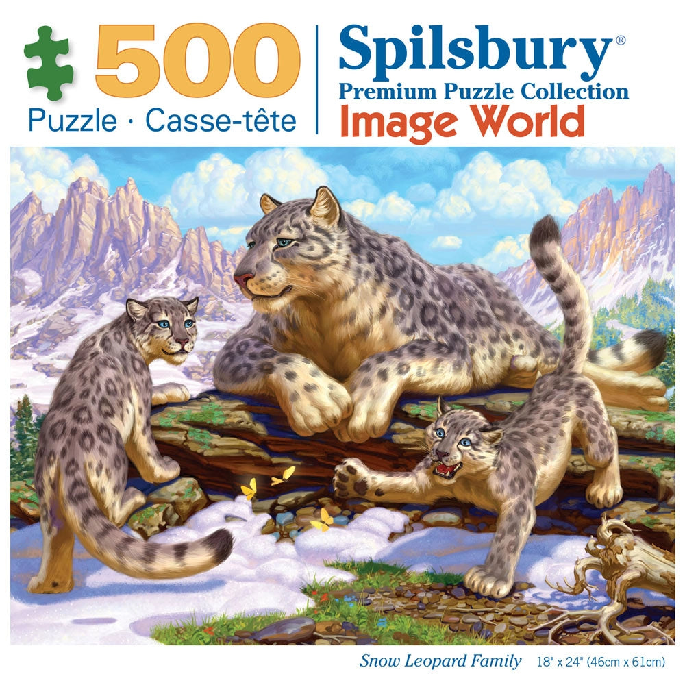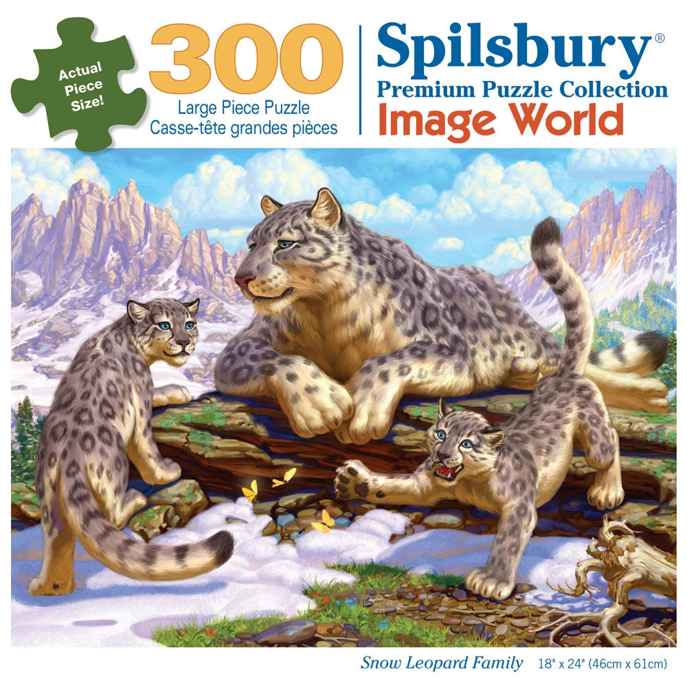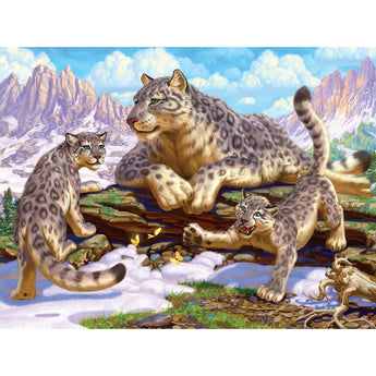 Explore the majestic beauty of the Himalayas with the Snow Leopard Family jigsaw puzzle, part of the Image World Collection. This 300-piece puzzle features a stunning depiction of a snow leopard family lounging amidst a serene mountain landscape. With their striking coats and expressive faces, the mother and her playful cubs are brought to life in exquisite detail, surrounded by snow-capped peaks, rocky outcrops, and blooming alpine flowers.