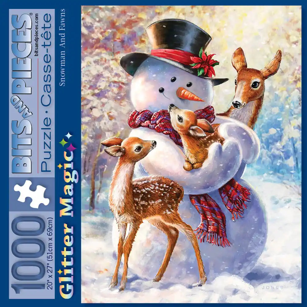 This jigsaw puzzle is designed by Larry Jones. Puzzles are renowned for their engaging complexity, offering a satisfying challenge with their smaller, intricate pieces. In a heartwarming glitter winter scene, a cheerful snowman tenderly cradles a tiny fawn in his arms, while the fawn's mother and sister lovingly watch nearby. The joyful snowman is adorned with a red plaid scarf and a top hat embellished with a festive poinsettia, creating a charming and enchanting vignette. Available in multiple piece counts.