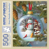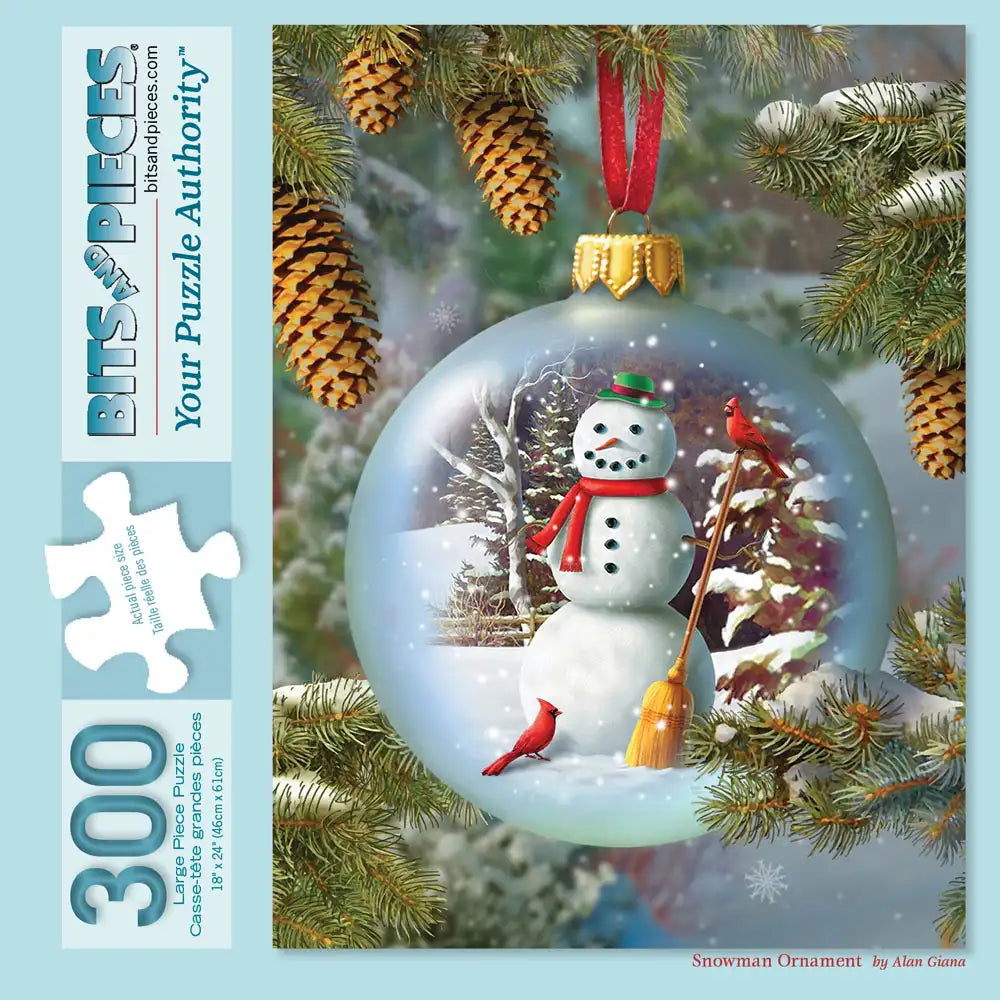 Capture the magic of winter with Snowman Ornament, a charming puzzle by Alan Giana. A jolly snowman, complete with a top hat and scarf, stands inside a festive ornament adorned with a snowy landscape. Red cardinals perch nearby, while pine cones and branches frame the scene, bringing the warmth of holiday cheer to your puzzle table. Measures 18" x 24"