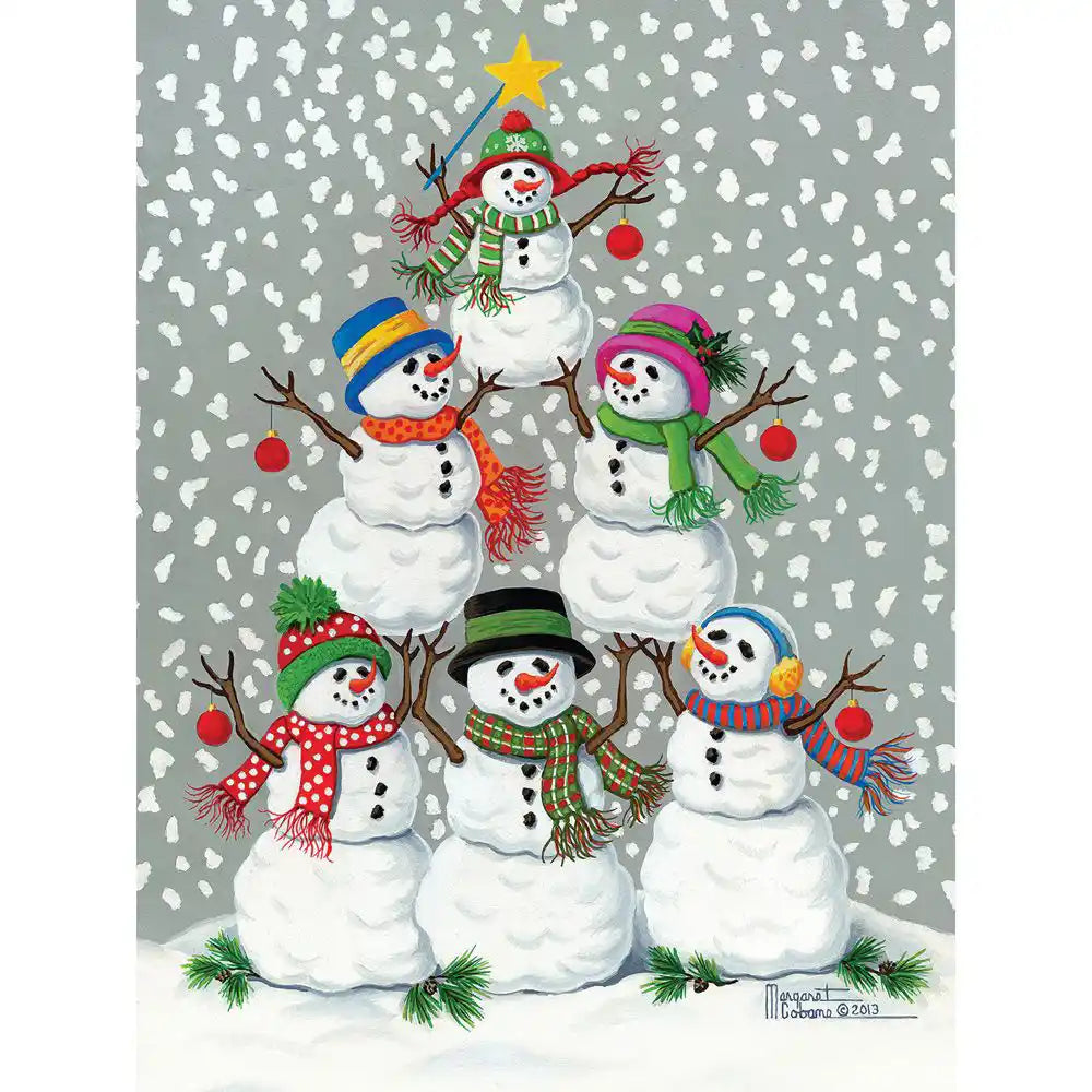 Snowman Tree is a jigsaw puzzle designed by artist Margaret Cobane. Snow is falling on this pyramid of happy, dressed up snowmen. Each has a colorful scarf and hat with the highest snowman carrying a star. Available in multiple piece counts.