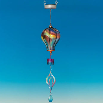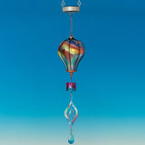 Bring a touch of whimsy to your garden with this enchanting hot air balloon solar wind spinner! The handblown glass balloon, featuring a mesmerizing purple and blue swirl design, sparkles in the sunlight by day and softly glows at night. A matching spinner below adds movement and color, creating a magical outdoor display. Measuring 33" x 5" x 5", it’s the perfect addition to elevate any outdoor space with charm and elegance. Made in the USA.
