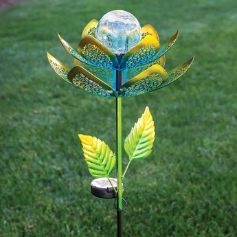 Illuminate your garden with the enchanting Solar LED Lotus Flower Spinner Stake! This stunning airbrushed metal design features a mesmerizing spinning motion and a glowing solar-powered glass ball, bringing elegance and tranquility to your outdoor space. Standing 43” tall, it’s the perfect centerpiece for your yard or garden. Assembly required. Includes a solar panel with 1 AAA Ni-CD rechargeable battery. Measurements 43"h X 4-1/4"w