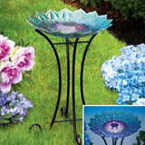 Our garden art birdbath is strikingly beautiful with its stylized gold embellished peacock feathers. The metallic painted glass has three-dimensional detailing. Holds the perfect amount of water for your feathered friends. The solar panel in the center charges during the day and automatically illuminates the bowl at dusk with six glowing LED lights. Includes an 18" wide x 24" tall powder-coated steel stand for sturdy placement in your garden or patio. Bowl measures 17-1/2" in diameter. Includes 2 AA NiMH rechargeable solar batteries and on/off switch.