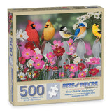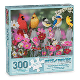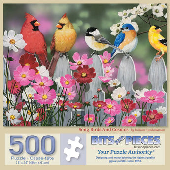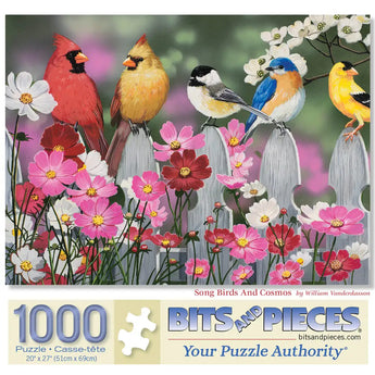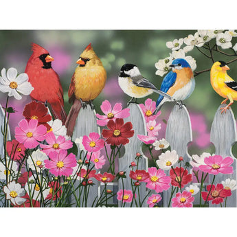 Bring the beauty of nature to life with Song Birds and Cosmos by William Vanderdasson. This delightful puzzle features a charming group of colorful songbirds perched on a rustic white picket fence, surrounded by vibrant cosmos flowers in full bloom. From the bright red cardinal to the cheerful goldfinch and soft-hued bluebird, each bird is rendered with exquisite detail, creating a serene and joyful scene. Perfect for bird lovers and nature enthusiasts, this puzzle captures the harmony and color of a garden alive with beauty. Piece together this charming celebration of nature and enjoy the peaceful allure of Song Birds and Cosmos!