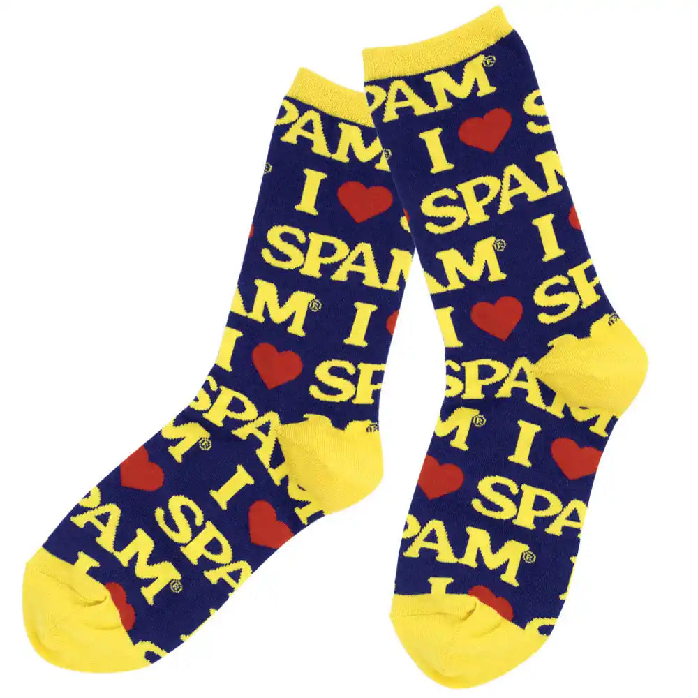 A perfect gift for anyone who appreciates the fully cooked canned meat! Authentic Spam colors of blue and yellow. It fits women's shoe sizes 5 -10-1/2. Machine wash. Made of cotton/ nylon/spandex.