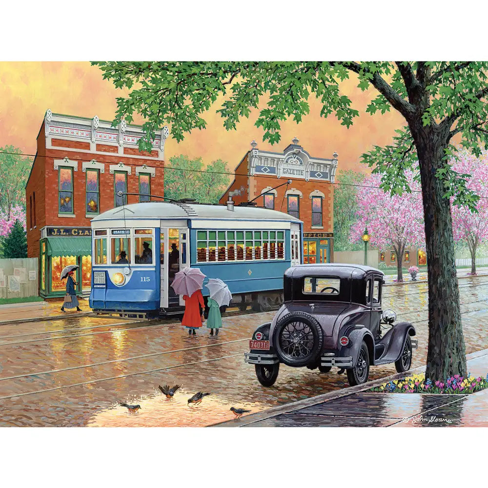 Step back in time to a quaint spring morning with Spring Market Day jigsaw puzzle by John Sloane. This charming jigsaw puzzle captures a nostalgic scene of a bustling small town, where a blue trolley stops on a rain-slicked street lined with blooming trees and historic brick storefronts. Locals, dressed in elegant vintage attire and carrying umbrellas, stroll through the market as birds splash playfully in a puddle. A classic car parked nearby adds a touch of timeless charm. Perfect for fans of nostalgic and tranquil scenes, this puzzle invites you to piece together the beauty and simplicity of a bygone era. Bring the charm of a classic spring market day to life, one piece at a time!