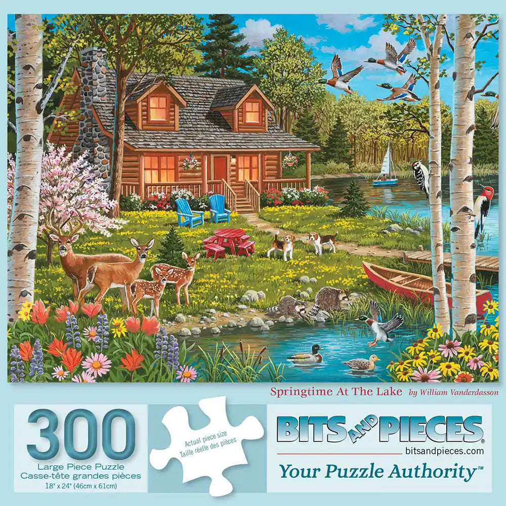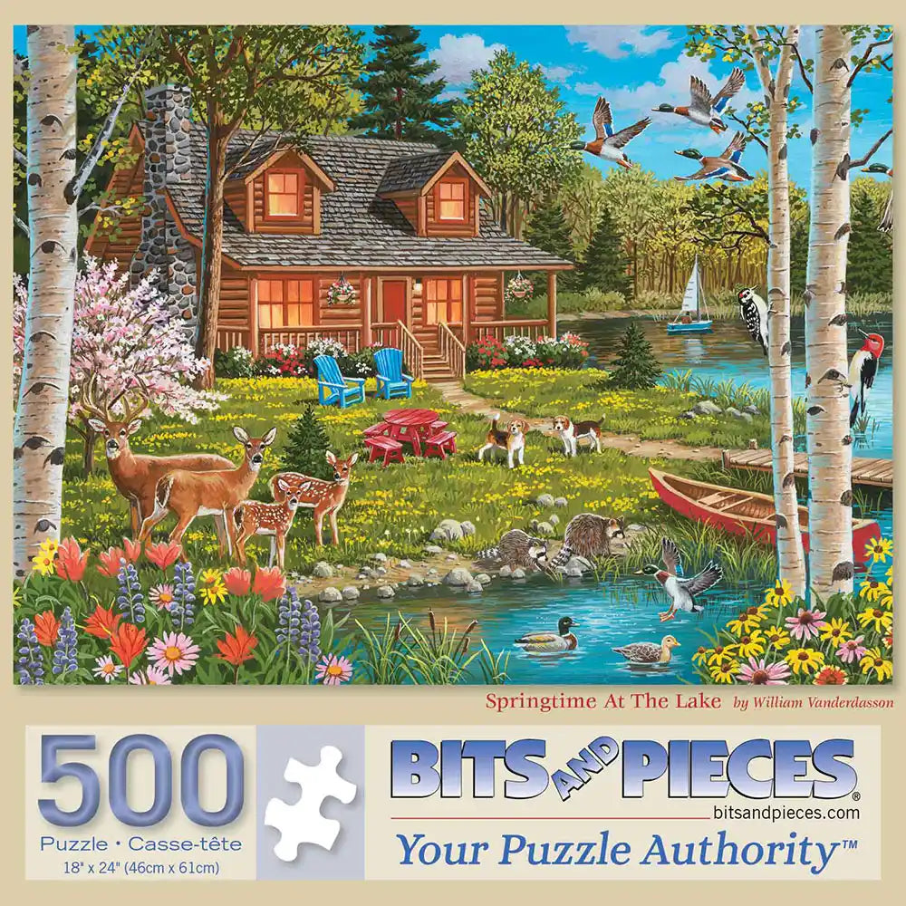 Breathe in the fresh spring air with Springtime At The Lake, a beautifully detailed puzzle by William Vanderdasson. A cozy log cabin sits nestled among blossoming trees, while deer, playful dogs, and birds bring this peaceful lakeside retreat to life. Ducks glide across the water, a red canoe waits at the shore, and sailboats drift in the distance. This charming puzzle is a relaxing escape into nature, perfect for anyone who loves the great outdoors.