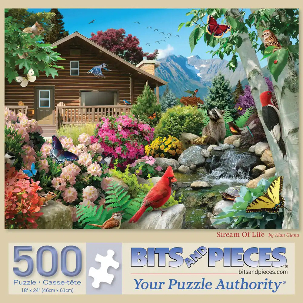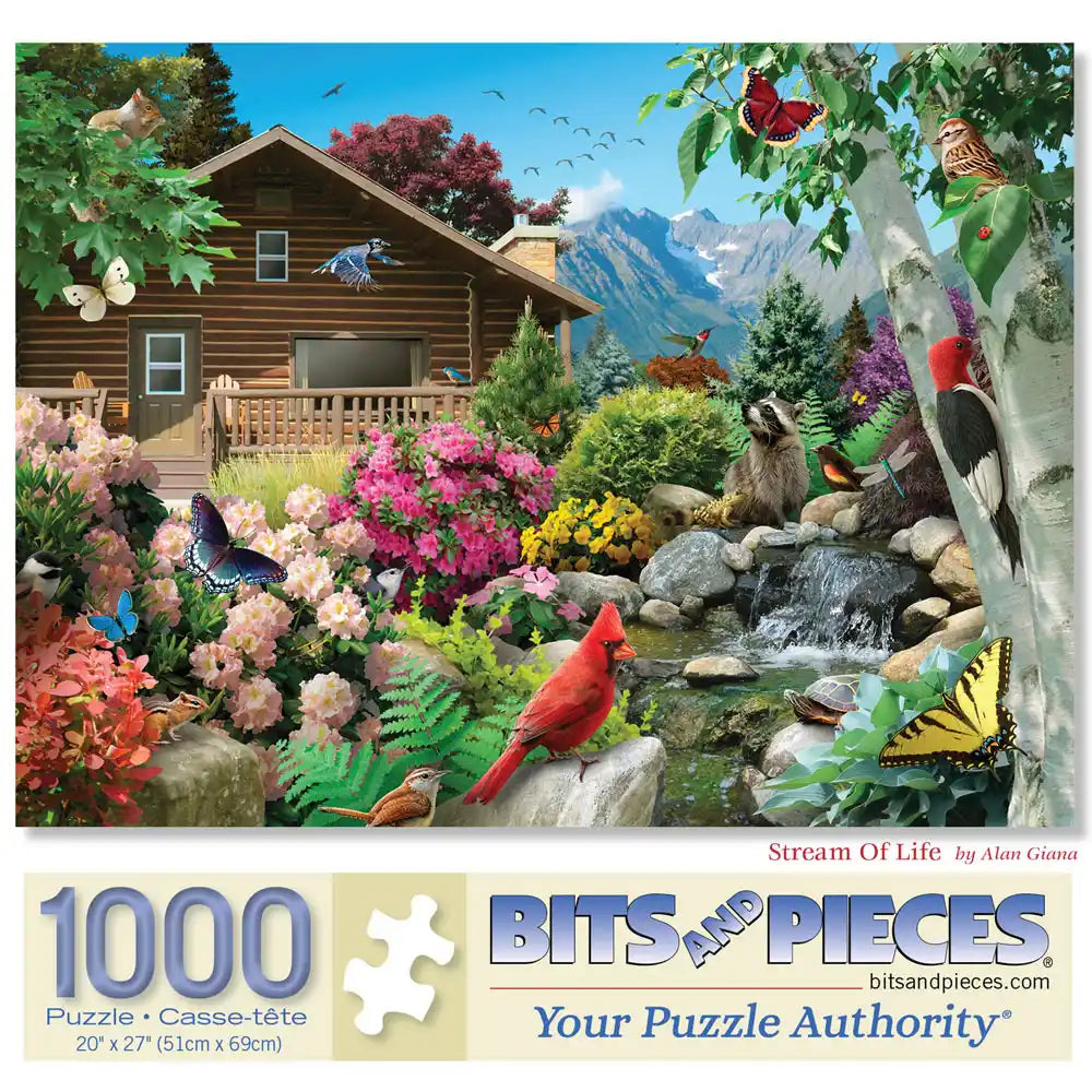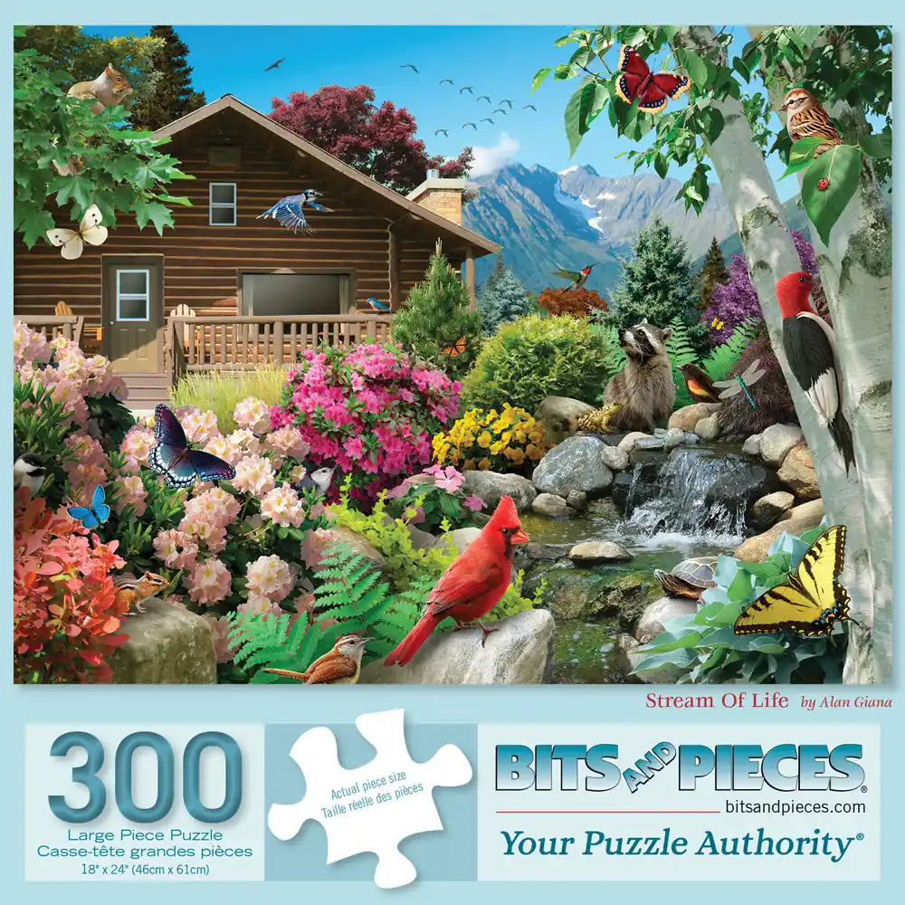 Stream Of Life jigsaw puzzle is designed by Alan Giana. Puzzles are renowned for their engaging complexity, offering a satisfying challenge with their smaller, intricate pieces. In this idyllic scene, a charming log cabin stands amidst the lush greenery, surrounded by a symphony of birds including a cardinal, woodpecker, hummingbird, and blue jay. Joining in the festivities are a playful raccoon, graceful butterfly, and inquisitive squirrel, all set against the backdrop of a babbling stream that runs through this picturesque spring puzzle. Available in multiple piece counts.