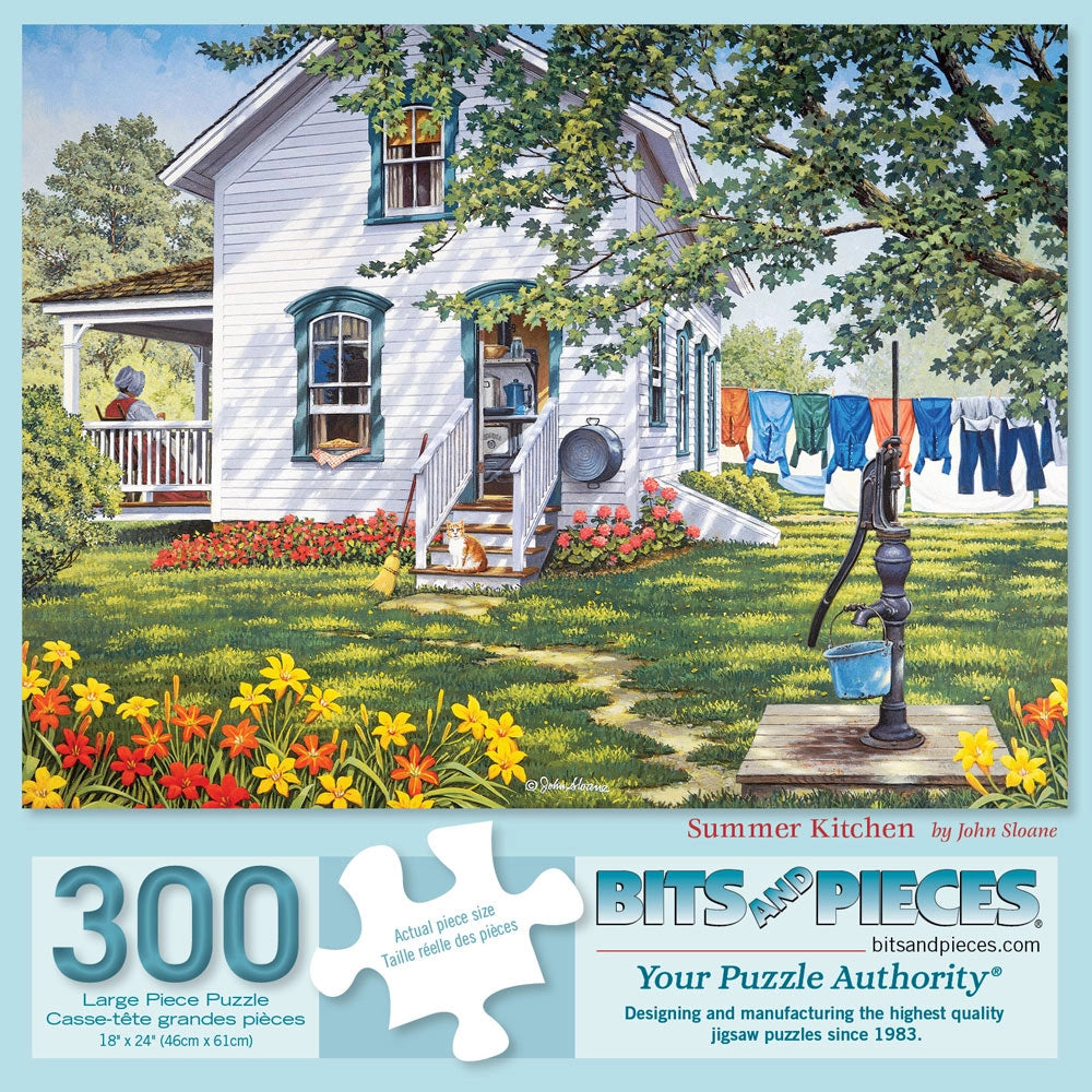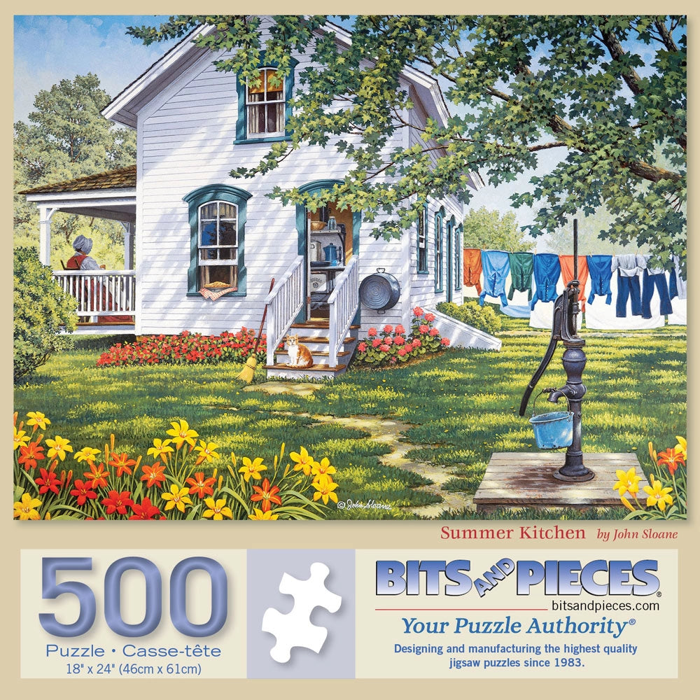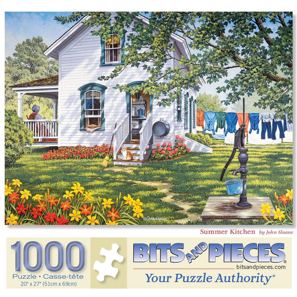 Experience the warmth and simplicity of summer with "Summer Kitchen," a captivating puzzle by artist John Sloane, available in 300, 500, and 1000-piece counts. This enchanting scene beautifully captures the essence of a peaceful summer day in a classic countryside setting. The image features a charming white house with a welcoming side porch where a woman enjoys the serene atmosphere. On the other side of the house, clothes hang gracefully on a clothesline, swaying gently in the breeze. A wash bin hangs from the side of the house, adding a nostalgic touch to the scene. Bright orange and yellow daylilies bloom in the garden, and a vintage water pump stands ready for use, completing the idyllic summer setting. John Sloane’s detailed artwork brings this heartwarming summer scene to life, making "Summer Kitchen" a perfect choice for puzzle enthusiasts and those who appreciate the timeless beauty of country life. Enjoy assembling this delightful puzzle and savor the simple joys of a bygone summer.