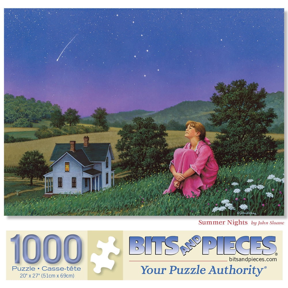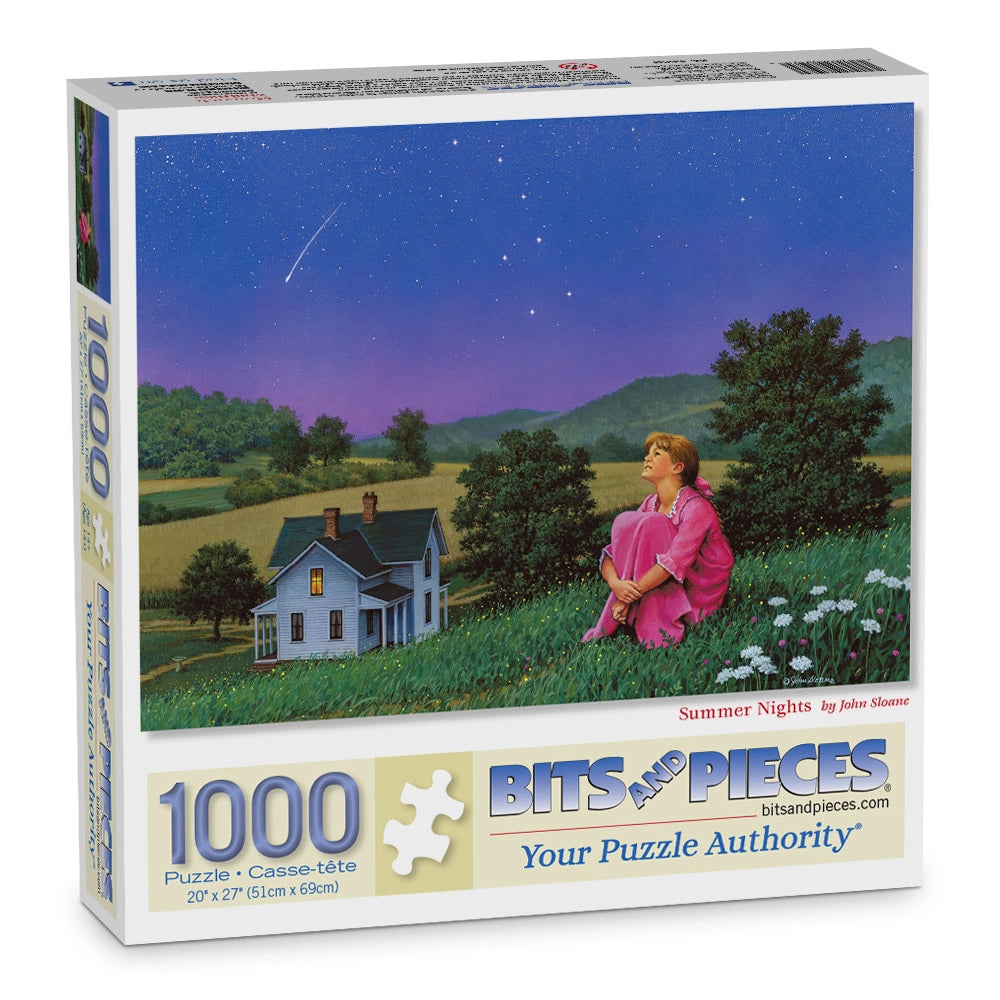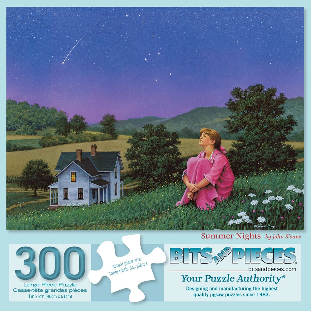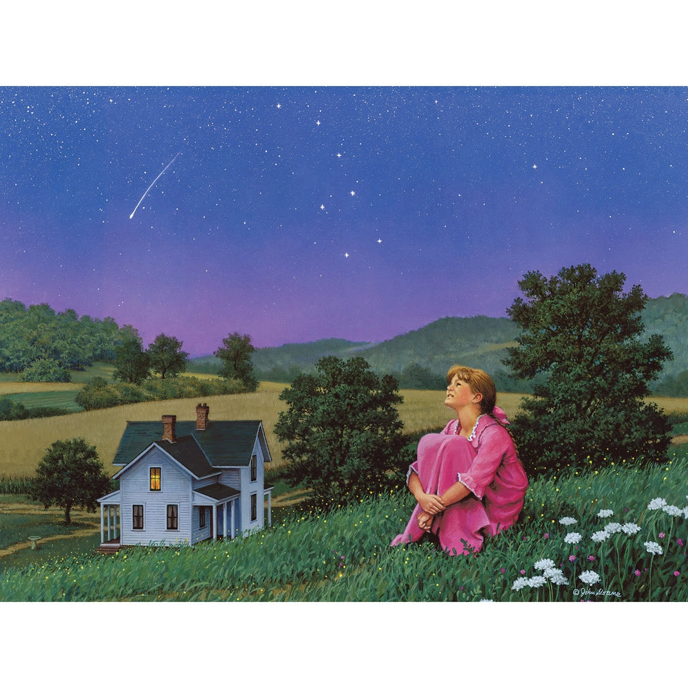 A quiet evening turns magical in Summer Nights by John Sloane. As stars rise over a cozy country home, a woman in pink sits among blooming clover, gazing into the twilight sky. Soft colors and subtle gradients add a soothing challenge to this peaceful jigsaw puzzle.
