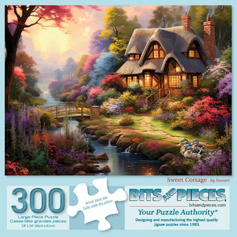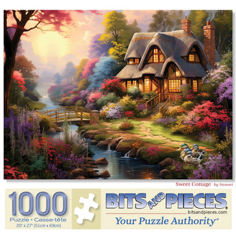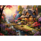Step into a storybook setting with our Sweet Cottage puzzle, featuring the enchanting artwork of Shawna Stewart. This serene scene captures a charming, warmly lit cottage nestled beside a babbling brook, where a quaint walking bridge arches over the gentle flow of the river. Ducks paddle leisurely off to the side, adding a touch of life to this peaceful retreat. Surrounded by a vibrant array of colorful flowers, this idyllic landscape offers a perfect escape into nature's beauty.