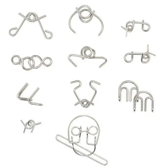 Grab our set of metal puzzles and start puzzling. Our innovative set features 10 precise brainteasers that inspire the mind to think. Each is crafted of strong steel which will last a lifetime. Each puzzle has a unique solution and makes a wonderful gift for puzzle lovers. Stumped? Solutions are included. Sizes range from smallest at 1-1/2" to the largest at 8". Ages 8+.