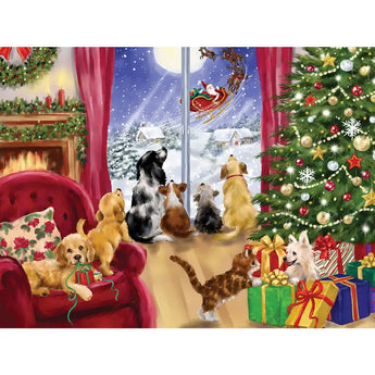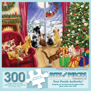 Celebrate the magic of the season with Thank You Santa by Jean Francois. This heartwarming puzzle features a group of excited pups gathered by the Christmas tree, watching Santa fly off into the night sky. With stockings hung, presents wrapped, and tails wagging, this scene radiates holiday cheer. Merry Christmas to all, and to all a good night!