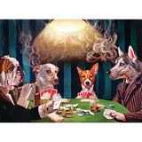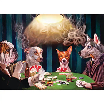 This 1000 piece jigsaw puzzle is designed by Lucia Heffernan and measures 19.25" x 26.6". Puzzles consisting of 1000 pieces are renowned for their engaging complexity, offering a satisfying challenge with their smaller, intricate pieces. Delight in the humor of a poker game like no other, as four dogs, including a bulldog and a husky, enjoy whiskey and cigars while trying their best to bluff their way to victory.
