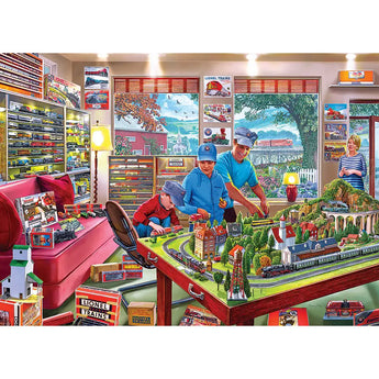 These puzzles are simply off the rails good! Enjoy one of America's greatest hobbies as you dive into these nostalgic images of train shops and enthusiastic collectors. As a bonus for the history buff, we've also included a puzzle featuring the complete history of trains! What better way to spend your time than chugging along on a train puzzle? This 1000-piece jigsaw designed by Steve Crisp measures 19-1/4" x 26-3/4".