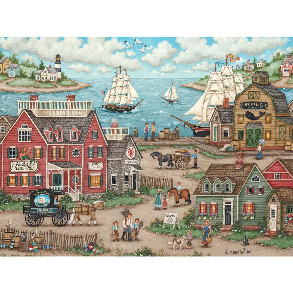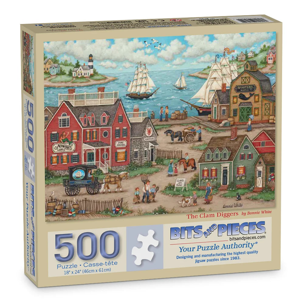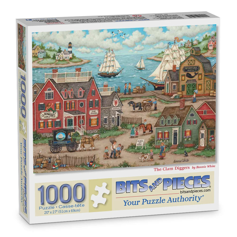 Bonnie White’s The Clam Diggers takes you to a bustling seaside harbor, where fishing boats dock and red-shingled buildings line the shore. Townsfolk gather for the day’s catch in this vibrant nautical jigsaw puzzle brimming with coastal charm and New England flavor.