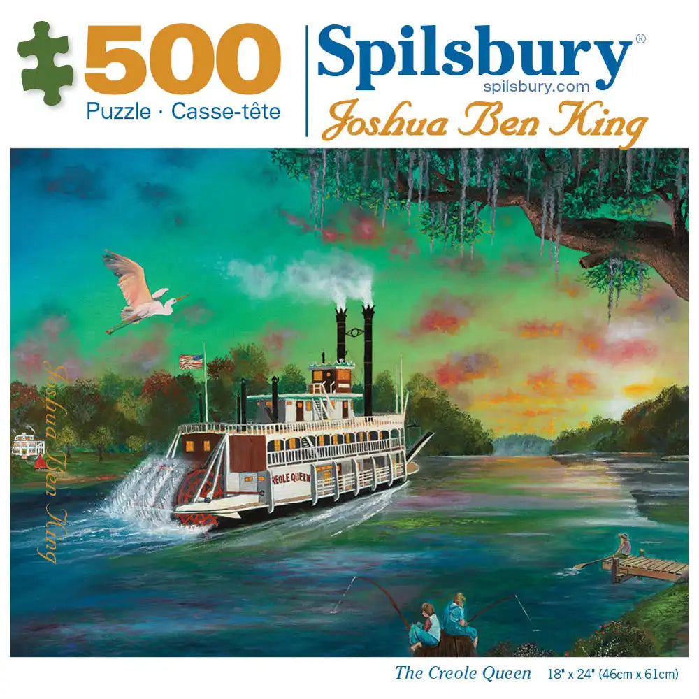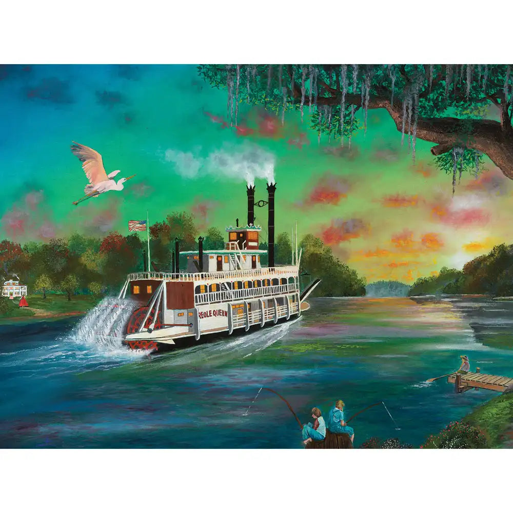 Experience the charm of Southern river life with this 500-piece jigsaw puzzle designed by Joshua Ben King. The Creole Queen captures a vibrant paddlewheel steamboat gliding along a glowing bayou at sunset, surrounded by lush greenery, Spanish moss, and peaceful moments of fishing along the riverbank. Measuring 18" x 24", this nostalgic and colorful puzzle is a relaxing and scenic journey perfect for lovers of Americana, riverboats, and timeless artistry.