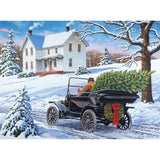 Bring the warmth of a vintage Christmas to life with this enchanting puzzle by John Sloane. Set against a snowy countryside backdrop, a classic car carries a freshly cut Christmas tree adorned with a red bow. A cozy farmhouse in the distance is beautifully decorated for the season, completing this nostalgic winter scene.
