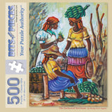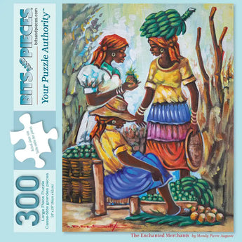 Celebrate the beauty of culture and everyday life with The Enchanted Merchants, a colorful 300-piece jigsaw puzzle by Mondy Pierre Auguste. This vibrant scene features three women engaged in a lively market exchange, surrounded by fresh fruits, woven baskets, and tropical tones. With expressive brushstrokes and bold color contrasts, this puzzle is a joyful tribute to community, tradition, and artistry. Finished size measures 18" x 24" and is available in multiple piece counts to suit every puzzler.