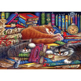 This jigsaw puzzle is designed by Irina Garmashova. Puzzles are renowned for their engaging complexity, offering a satisfying challenge with their smaller, intricate pieces. In a cozy setting, two sleepy kittens curl up for a nap on a pile of books, their gentle purrs adding a touch of tranquility. Meanwhile, another curious kitty keeps a watchful eye as a playful mouse scampers around, Available in multiple piece counts.
