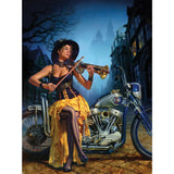 Enter a world of mystery and allure with David Uhl’s captivating 1,000-piece puzzle. This stunning artwork features a striking woman seated on a vintage motorcycle, playing a golden violin under the eerie glow of a moonlit night. Dressed in a Victorian-inspired corset and flowing golden skirt, she exudes confidence and elegance, while the shadowy cobblestone streets and gothic architecture in the background add a sense of intrigue. The combination of steampunk, music, and motorcycle culture makes this a mesmerizing scene filled with detail and atmosphere.