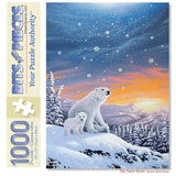 This jigsaw puzzle is designed by Jon Rattenbury. Puzzles are renowned for their engaging complexity, offering a satisfying challenge with their smaller, intricate pieces. Two polar bears sit atop a snowy mountain, surrounded by delicate snowfall under the enchanting hues of an orange and blue sky. This tranquil scene captures the majesty of the Arctic landscape and the quiet elegance of polar bears in their natural habitat. Available in multiple piece counts.