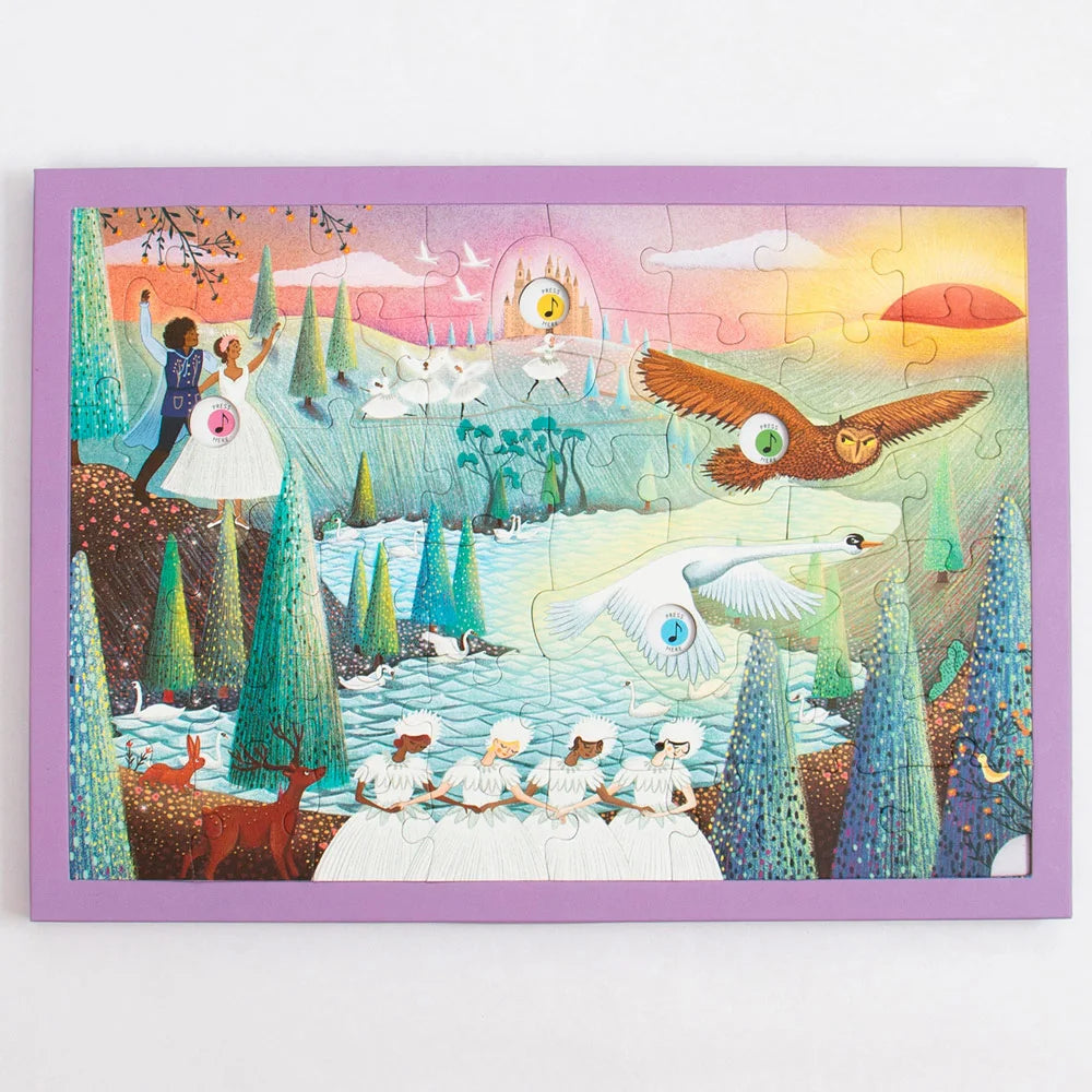 Piece together the beauty of Swan Lake with this unique musical jigsaw puzzle. When assembled, press four of the pieces to hear sound clips from Tchaikovsky’s beloved ballet. An unforgettable activity to share with young music lovers and aspiring ballerinas. Includes story poster. Ages 5+. 48 large pieces, 11¾” x 8⅓”.