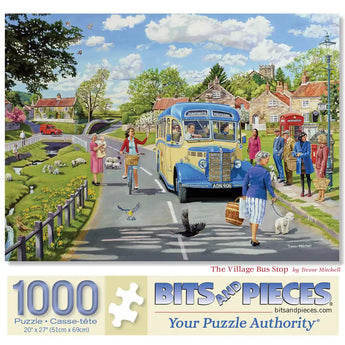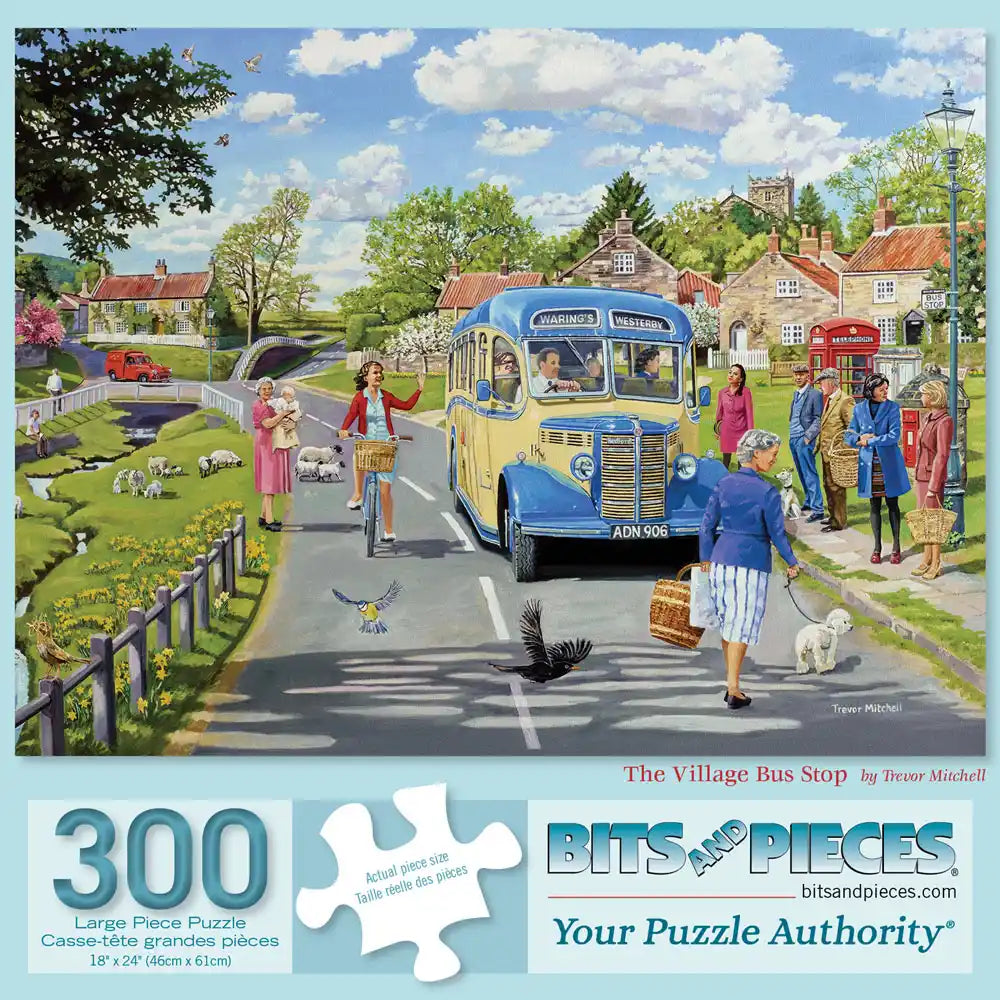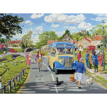 Step into a picturesque countryside scene with The Village Bus Stop, a charming jigsaw puzzle designed by Trevor Mitchell. Featuring a lively moment as villagers gather around a classic yellow-and-blue bus, this nostalgic image is filled with delightful rural details—from cyclists and dog walkers to sheep grazing near the stream. Available in multiple piece counts, including 300 large pieces, and measuring 18" x 24", this puzzle is a heartwarming tribute to simpler times and community spirit.