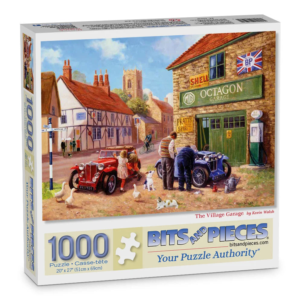 Enjoy a slice of mid-century charm in The Village Garage jigsaw puzzle by Kevin Walsh, where a mechanic tunes up classic British motors while neighbors catch up under the afternoon sun. With vintage cars, hand-lettered signage, and the local church just down the lane, this cozy scene captures the heartbeat of a small-town garage that runs on more than just petrol—it runs on community.