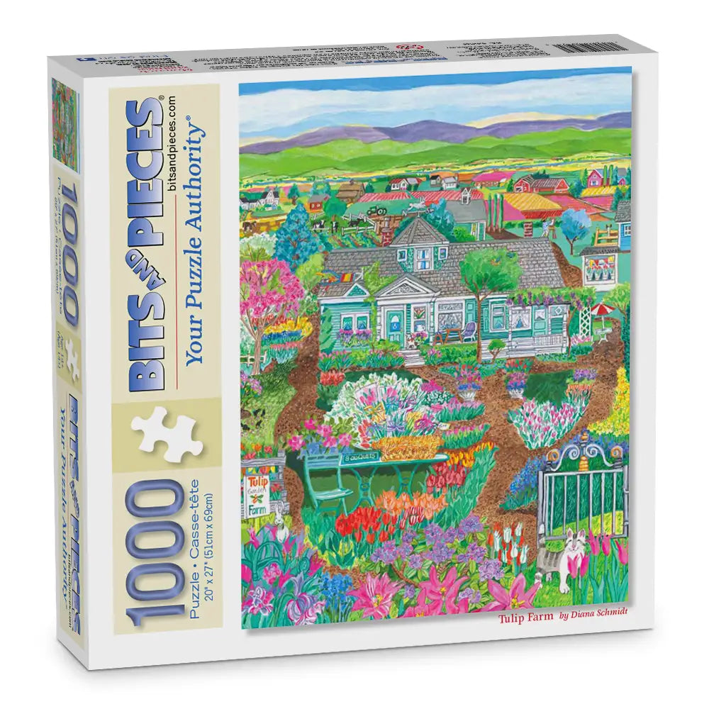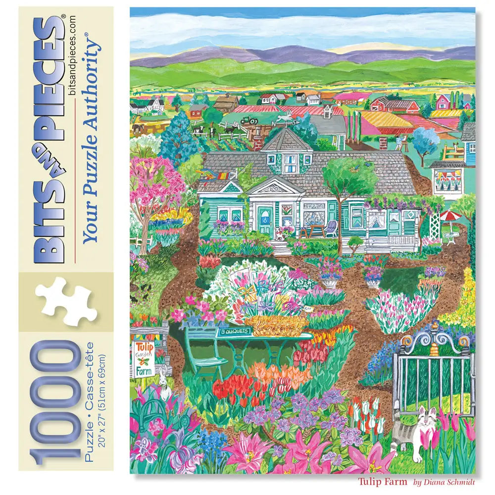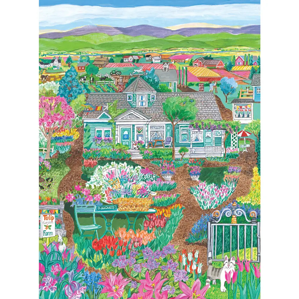 Celebrate the vibrant beauty of spring with the Tulip Farm puzzle by Diana Schmidt. This delightful scene bursts with color, showcasing a charming countryside farmhouse surrounded by lush gardens overflowing with tulips and other vibrant blooms. Beyond the picket fence, rolling fields of flowers stretch toward the horizon, where quaint barns and verdant hills complete the picturesque landscape. Playful details, like a curious cat by the gate and bustling farm activity, add whimsy to this lively setting. Perfect for garden enthusiasts and puzzle lovers, this artwork captures the joy and renewal of springtime in full bloom. Bring the charm and colors of the Tulip Farm to life, one puzzle piece at a time!