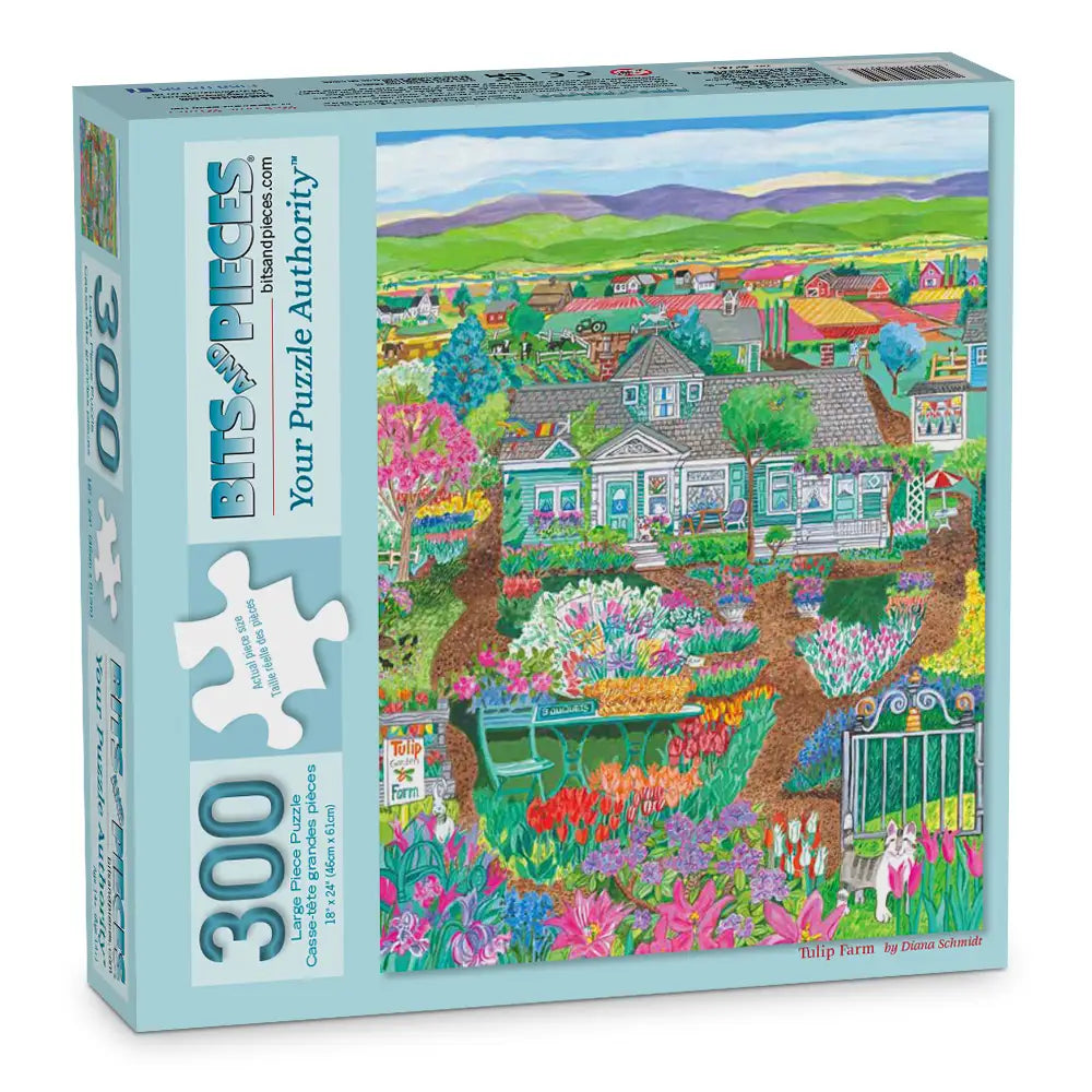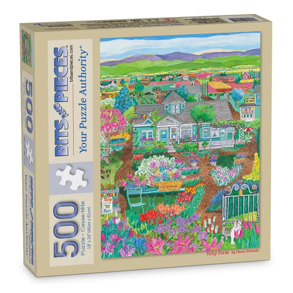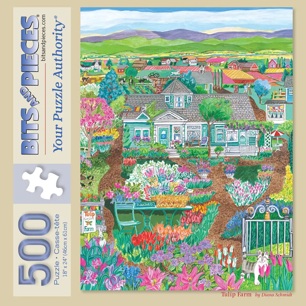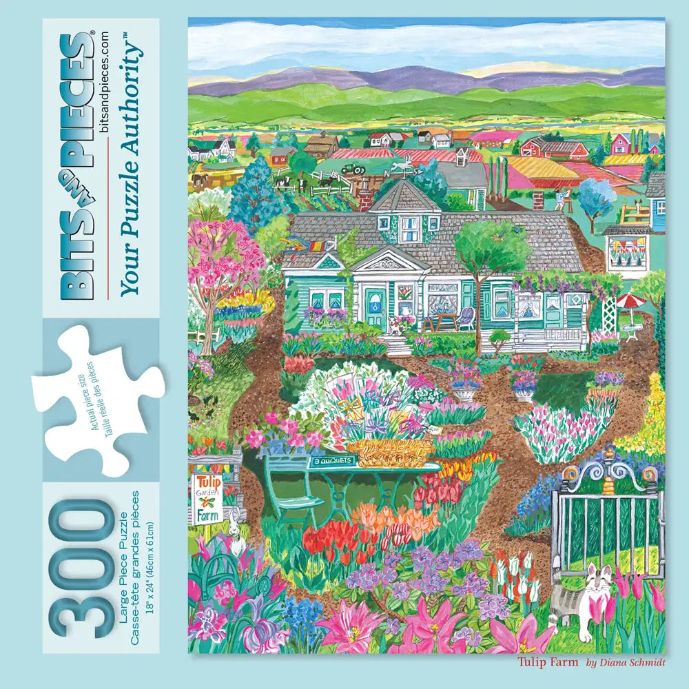 Celebrate the vibrant beauty of spring with the Tulip Farm puzzle by Diana Schmidt. This delightful scene bursts with color, showcasing a charming countryside farmhouse surrounded by lush gardens overflowing with tulips and other vibrant blooms. Beyond the picket fence, rolling fields of flowers stretch toward the horizon, where quaint barns and verdant hills complete the picturesque landscape. Playful details, like a curious cat by the gate and bustling farm activity, add whimsy to this lively setting. Perfect for garden enthusiasts and puzzle lovers, this artwork captures the joy and renewal of springtime in full bloom. Bring the charm and colors of the Tulip Farm to life, one puzzle piece at a time!