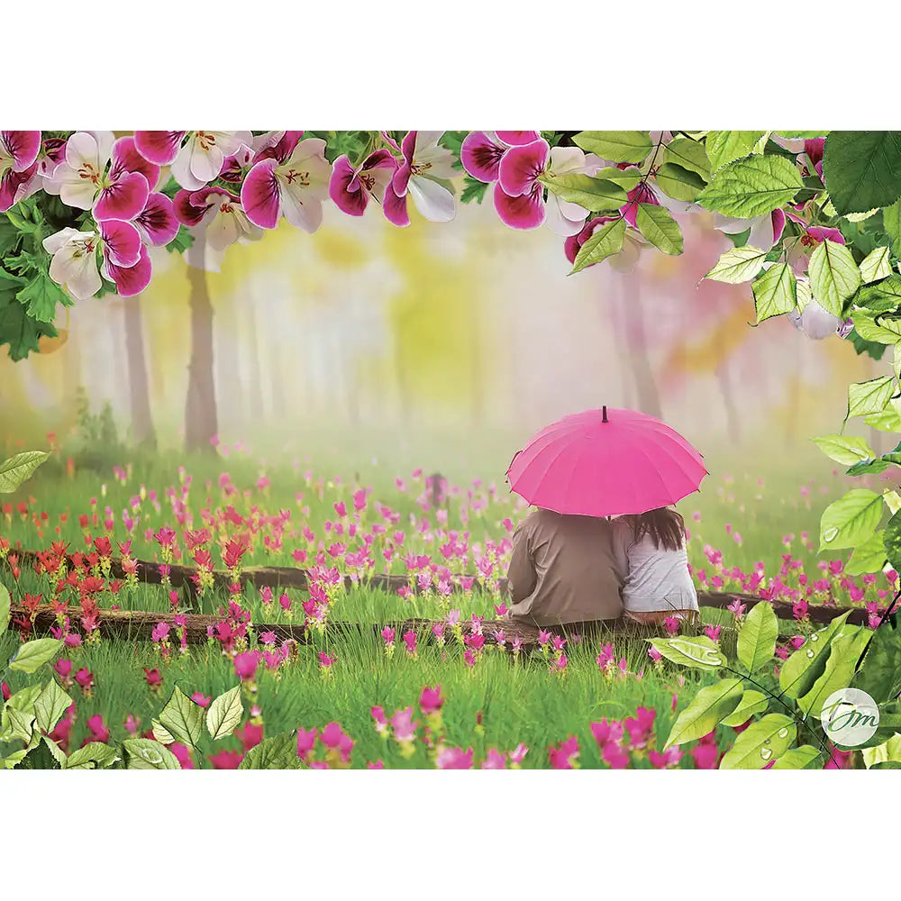 This 1000-piece jigsaw puzzle is designed by Debbie Macomber and measures 19" x 27". A couple sits under the pink umbrella enjoying the green grass and blooming flowers of the springtime.