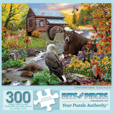Explore the wonders of wildlife with "Uninvited Guest," a captivating puzzle designed by Mary Thompson. This vibrant artwork features a scenic riverside mill surrounded by a variety of animals, including a bear, deer, foxes, an eagle, and playful raccoons. The colorful flowers and lush foliage add to the beauty of this tranquil yet lively natural setting. Perfect for nature lovers and fans of intricate wildlife scenes, this puzzle offers a delightful and immersive experience. Bring the charm of the outdoors to your home with this beautifully detailed design.