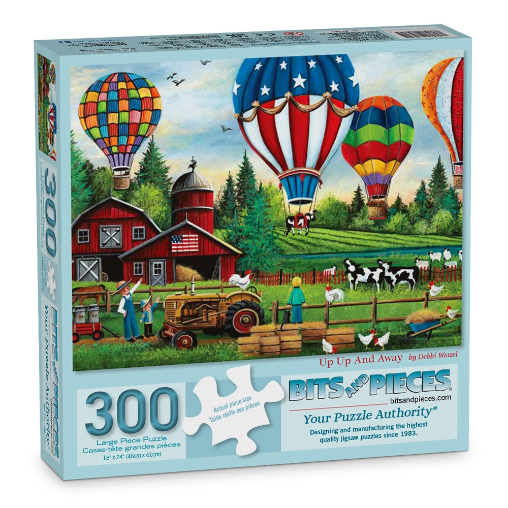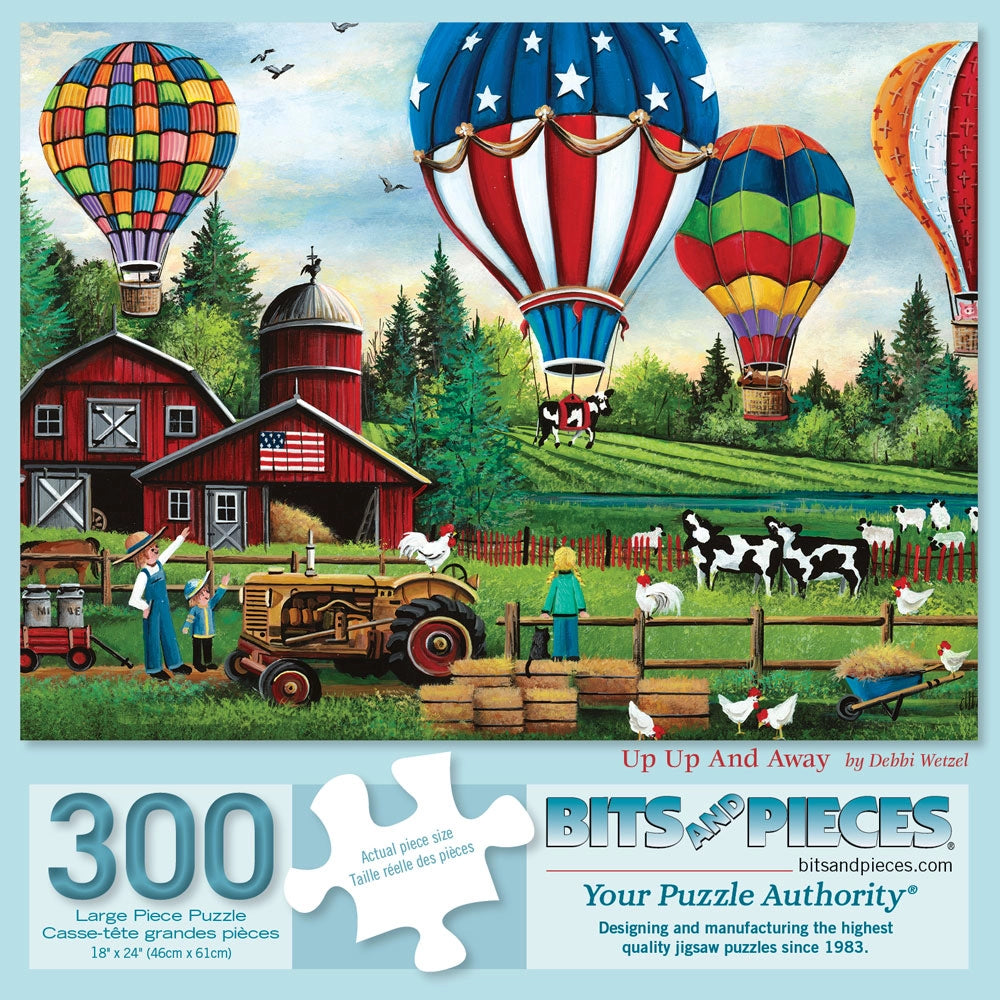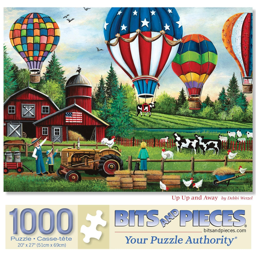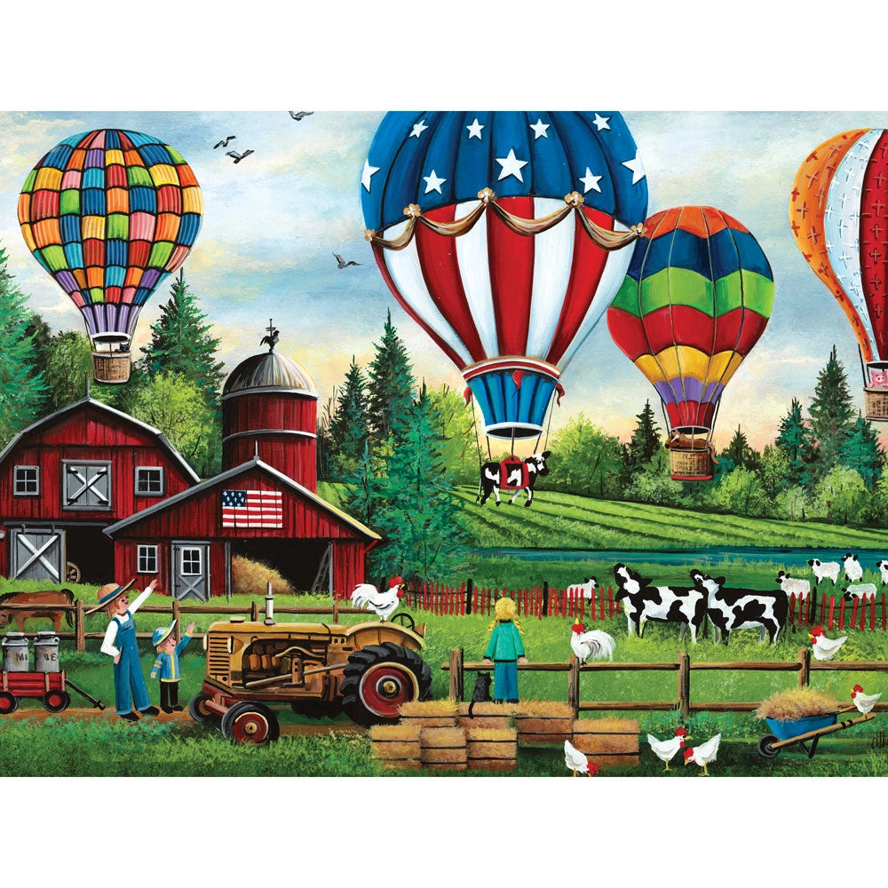 Hot air balloons rise over green pastures and red barns in this colorful summer puzzle by Debbi Wetzel. With farm animals, fields, and festive skies, it’s packed with seasonal joy and down-home charm. A bright and breezy way to enjoy a summer’s day at your puzzle table.