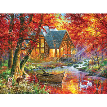 Welcome the warmth of autumn with Vibrant Morning, a stunning puzzle by Abraham Hunter. A cozy log cabin glows with golden light as the morning sun filters through fiery red and orange leaves. A peaceful stream winds past a rustic canoe, while curious raccoons, graceful deer, and gentle ducks bring the serene woodland scene to life. With brilliant fall colors and exquisite detail, this puzzle is a breathtaking escape into nature’s beauty. This is not a Bits And Pieces brand puzzle.