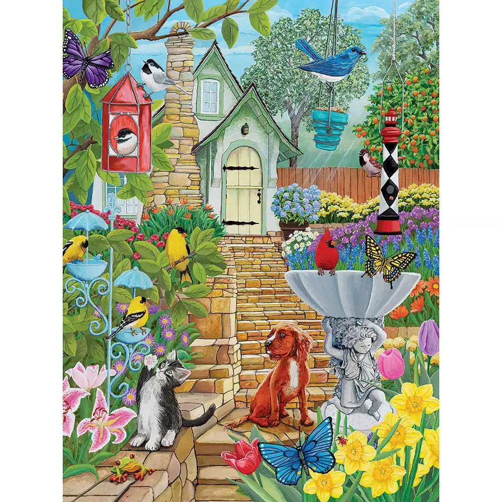 This 1000-piece jigsaw puzzle is designed by Kathy Bambeck and measures 20" x 27". This garden is filled with vintage birdfeeders and birdbaths where the birds gather to eat and splash around. The dog and kitten watch the birds play from the steps.