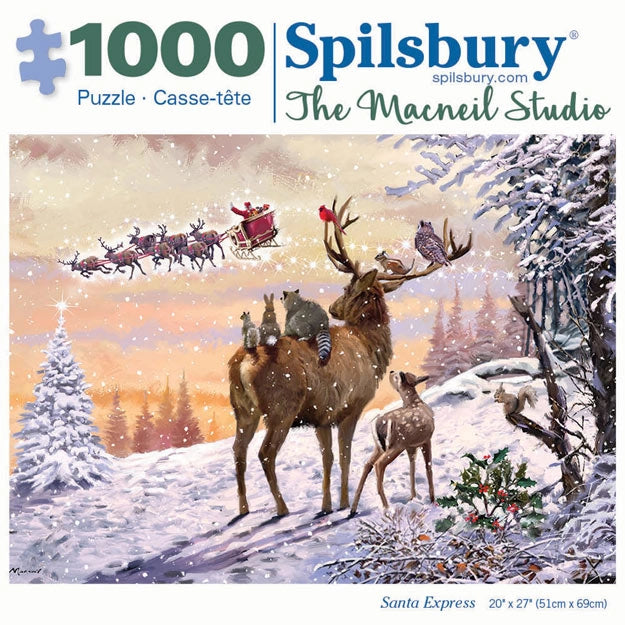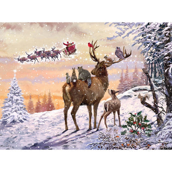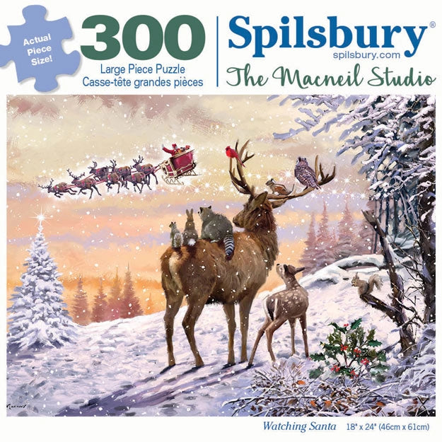 Experience the magic of Christmas Eve with Watching Santa, a heartwarming puzzle by The Macneil Studio. This enchanting scene features woodland animals, including deer, raccoons, and cardinals, gazing up at Santa and his sleigh as they soar through the snowy sky. The peaceful winter landscape creates a sense of wonder and festive joy. Perfect for bringing the holiday spirit into your home, this puzzle offers a cozy and delightful experience. Available in 300 and 1000-piece counts.