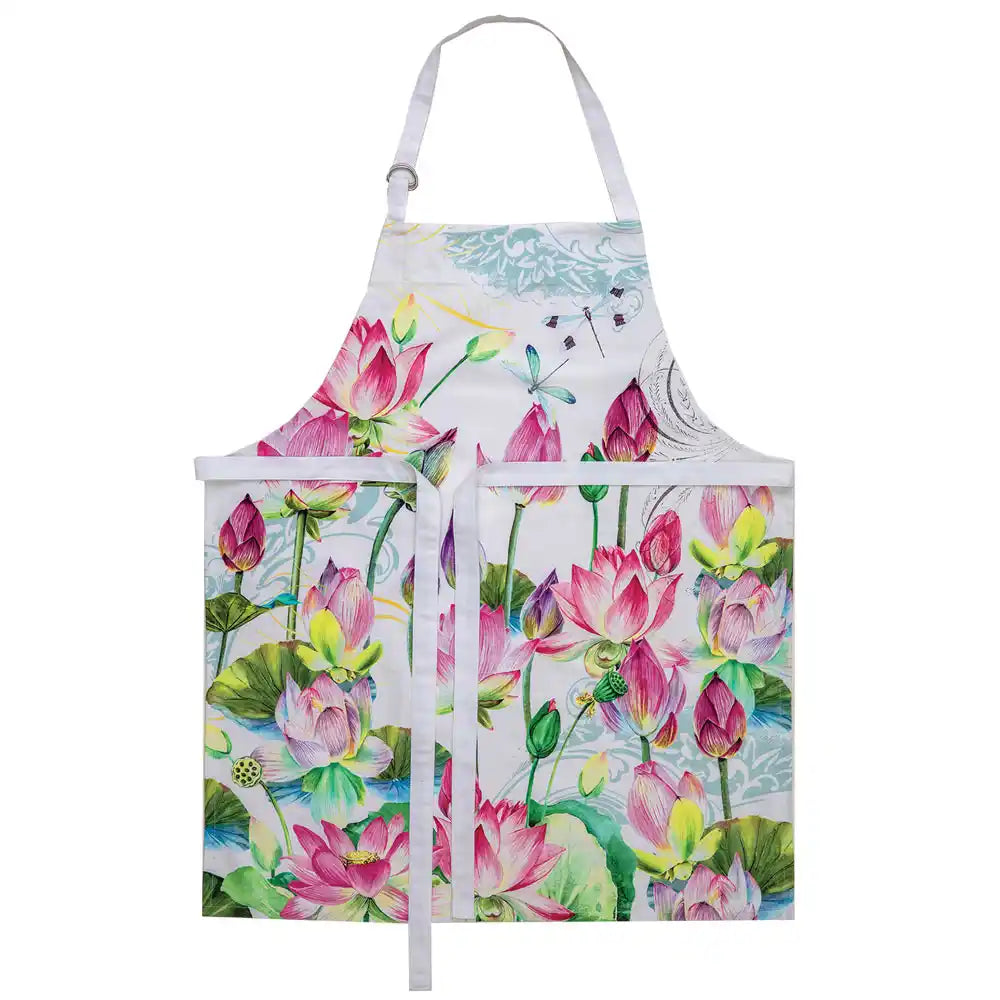 This chef's apron has a elegant touch with beautiful lilies and dragonflies. You tie at the waist and adjust the neck with metal double D-rings. Measures 27" long. 100% cotton fabric.