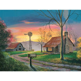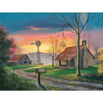 Experience the serenity of rural life with this 1,000-piece jigsaw puzzle designed by Peggy Knight, measuring 20" x 27". A cozy log cabin with a glowing fireplace sits beneath a stunning sunset, surrounded by a rustic barn, windmill, and open countryside. The winding dirt path and vintage mailbox add to the nostalgic charm of this peaceful landscape. With rich colors and intricate details, this puzzle offers a relaxing and rewarding challenge for puzzle enthusiasts.