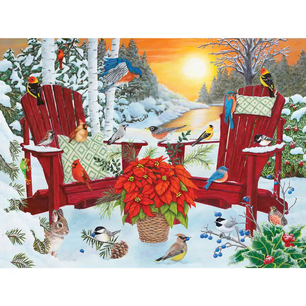 Celebrate the beauty of winter wildlife with this charming 500-piece jigsaw puzzle designed by Kathy Bambeck. Measuring 18" x 24", this heartwarming scene features vibrant songbirds perched on red Adirondack chairs at sunset, surrounded by snowy trees, a festive poinsettia, and curious forest animals. With its rich colors and peaceful setting, this puzzle offers a delightful challenge for bird lovers and nature enthusiasts alike.