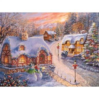 This jigsaw puzzle is designed by Nicky Boehme. Puzzles are generally less challenging and can often be completed in just one day. As the sun sets, winter cottages come to life, aglow with a warm radiance that sparkles amidst the snow. The lights create a magical scene, turning the snowy landscape into a glistening wonderland. Available in multiple piece counts.