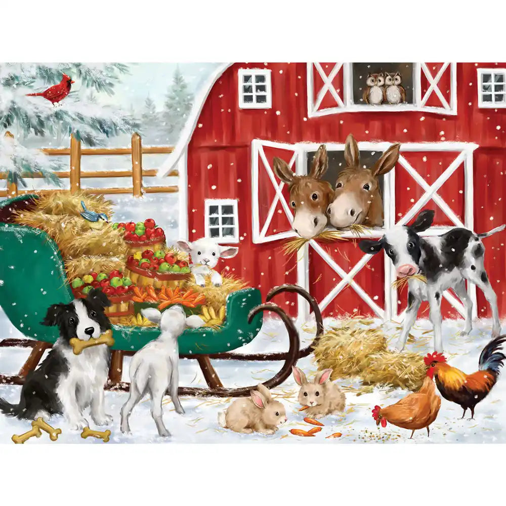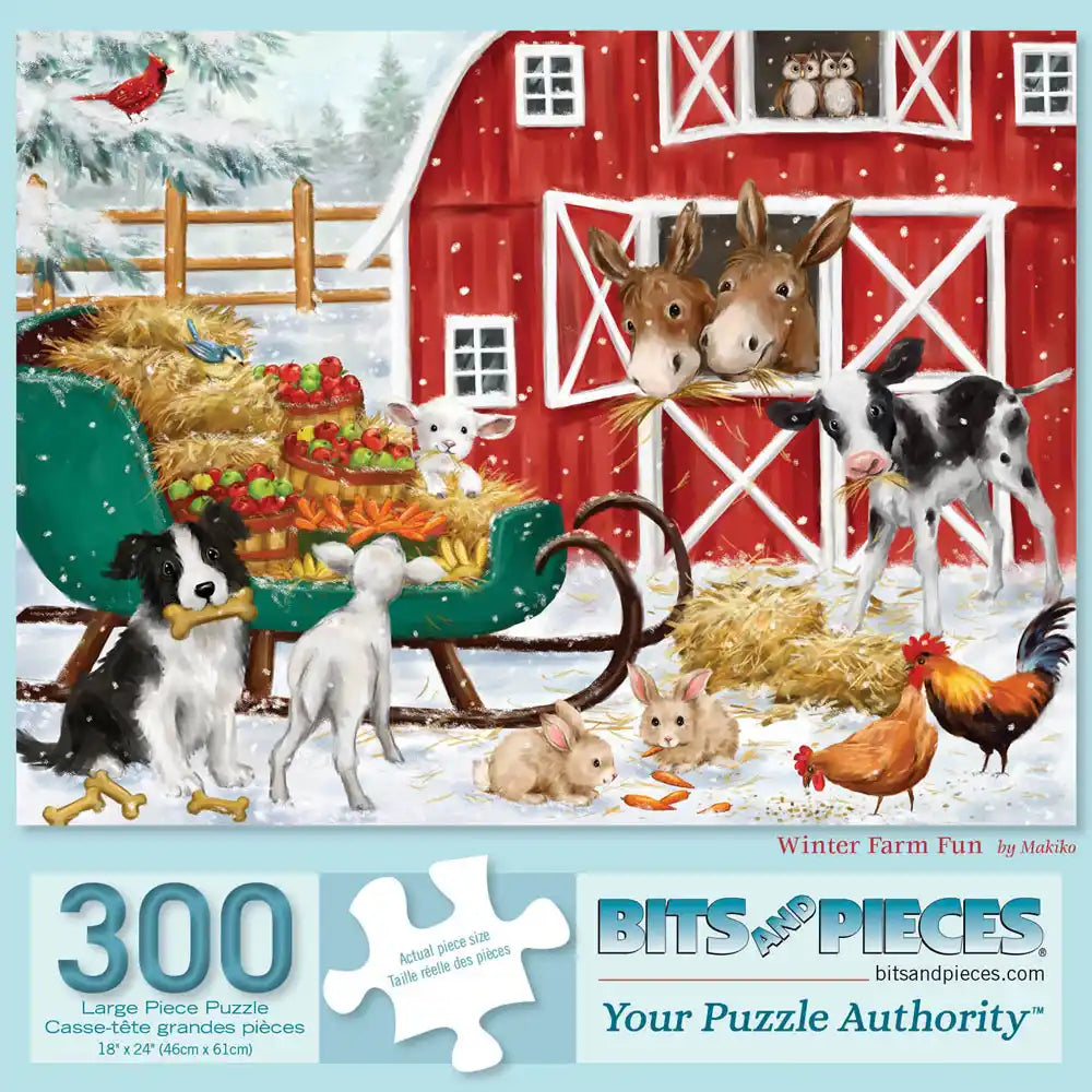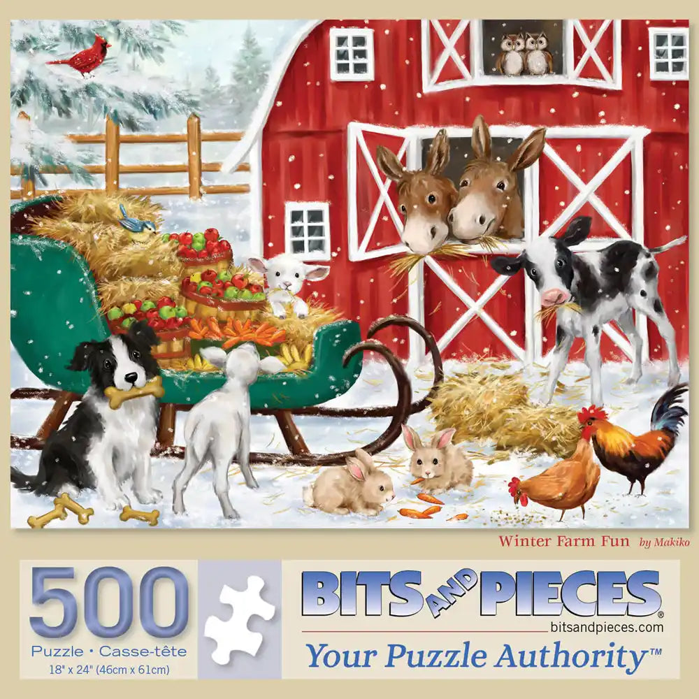 Experience the charm of “Winter Farm Fun” by Makiko, a delightful puzzle capturing the warmth and joy of a snowy day on the farm. A vibrant red barn is the heart of this scene, where donkeys peek out from their stalls, a curious calf munches on hay, and bunnies nibble on carrots. A festive sleigh overflows with apples and treats, while playful pups frolic nearby. Every detail celebrates the magic of winter’s simple pleasures.