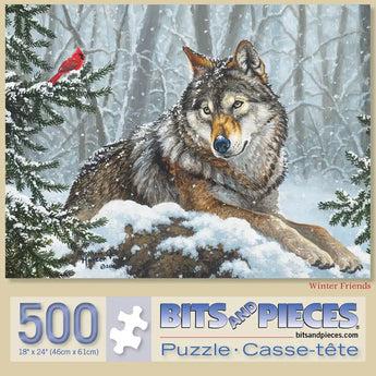 Winter Friends is a jigsaw puzzle designed by artist Abraham Hunter. A winter wolf gazes with curiosity at a red cardinal perched on a pine tree. The woods are covered with snow as fluffy flakes fall through the sky. Available in multiple piece counts.