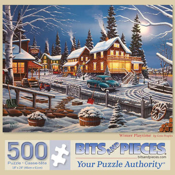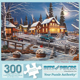 This jigsaw puzzle is designed by Geno Peoples. Transport yourself to a peaceful snowy evening as a classic car arrives at the side of a warmly lit house, capturing the serene magic of a winter night. Available in multiple piece counts.