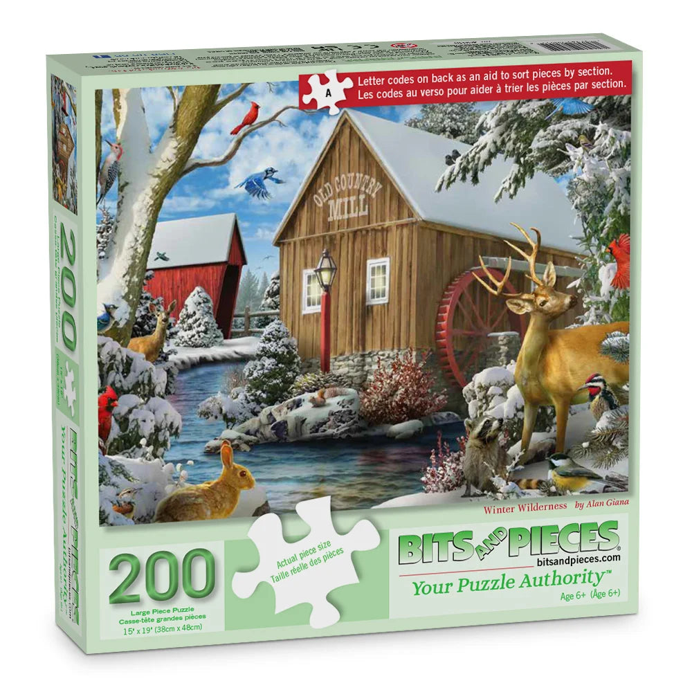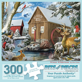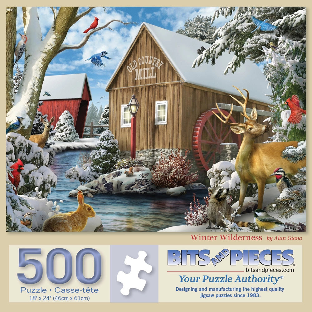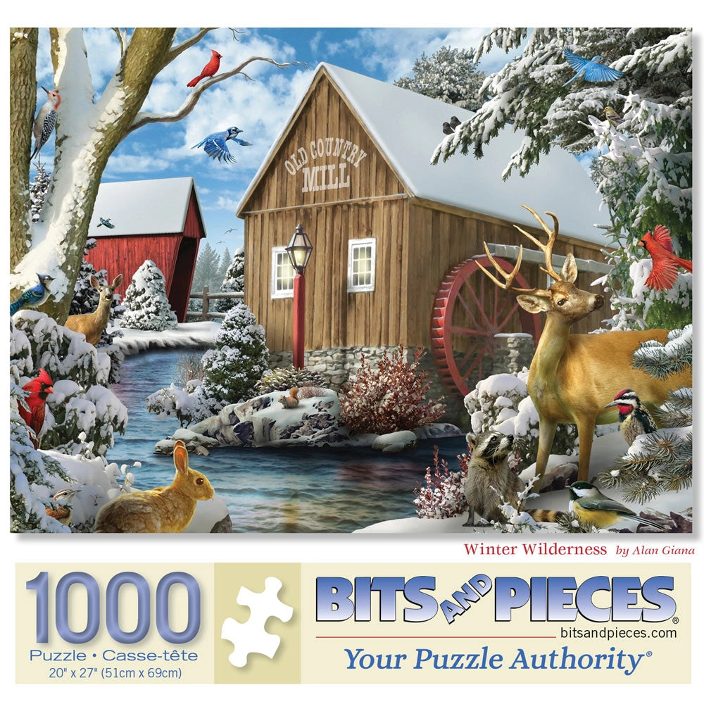 A down-home winter scene, this puzzle features curious winter creatures gathered around the "Old Country Mill." Red-capped woodpeckers, a fuzzy raccoon, a handsome hare, and two intrigued deer take a peek around the place on a snowy winter's day. Choose the right level of challenge for you: this jigsaw puzzle, designed by Alan Giana, is available three-piece counts. Cozy up with these fun critters, and enjoy the meditative practice of puzzling this winter!