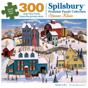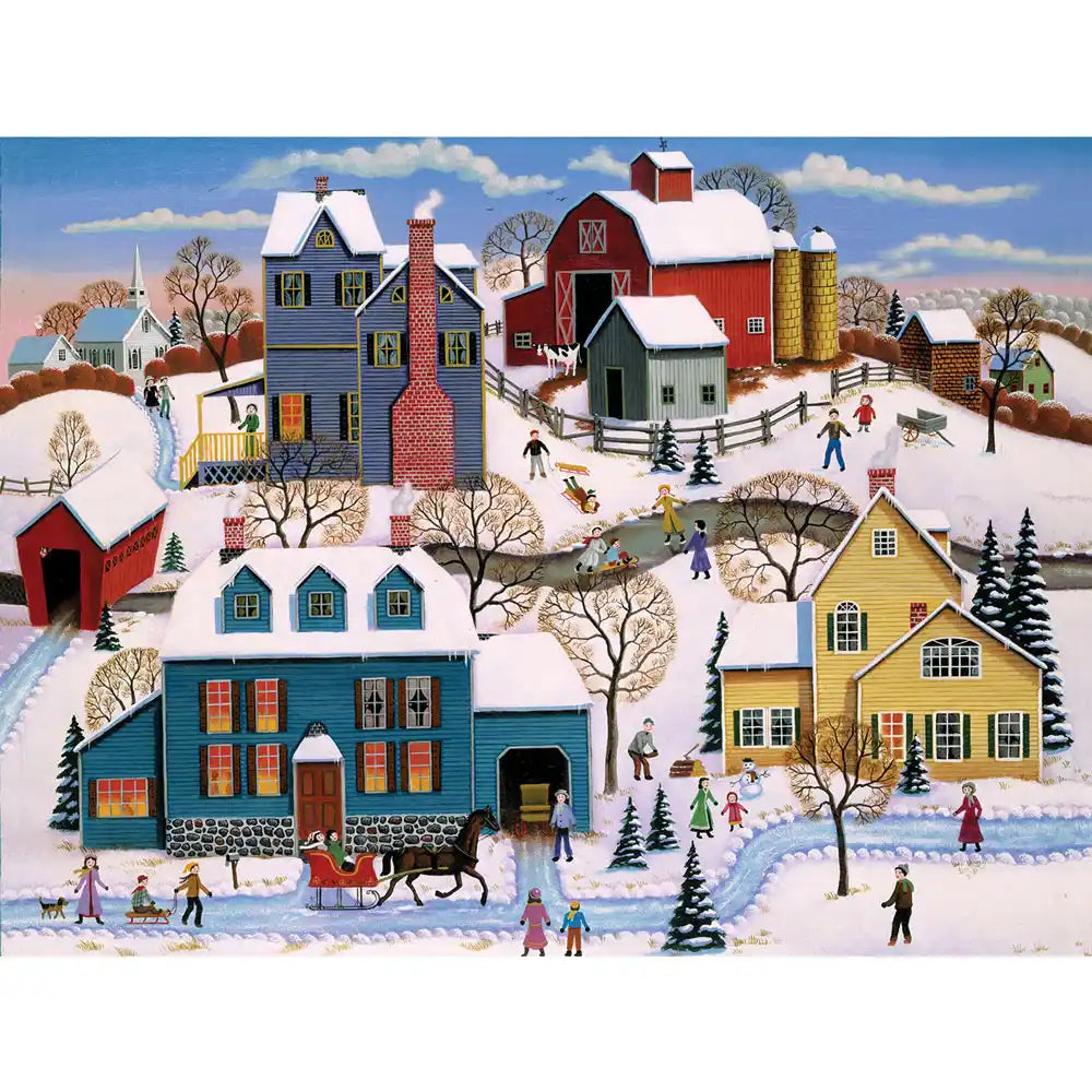 This jigsaw puzzle is designed by Steven Klein. Puzzles are generally less challenging and can often be completed in just one day. Featuring a quintessential red barn as the backdrop, this scene comes alive with kids joyfully sledding down snowy hills and a horse-drawn carriage adding to the winter magic. Embrace the warmth of a simpler time as you piece together this heartwarming winter puzzle. Available in multiple piece counts.